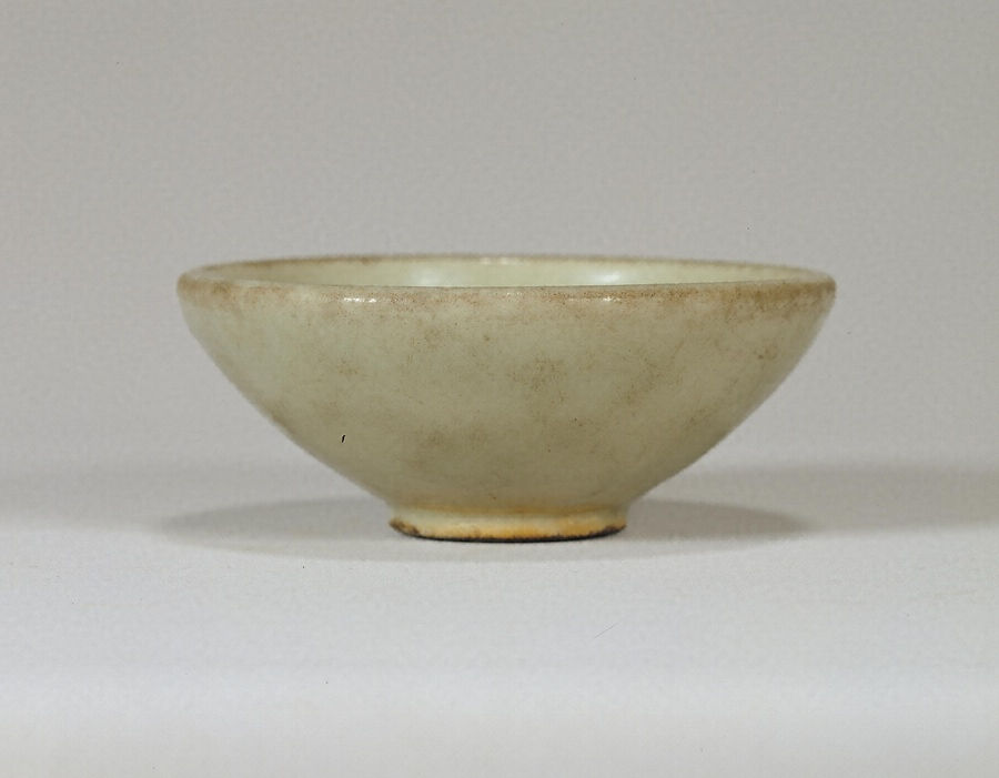 大正3年(1914)に購入した作品。黒灰色の素地に、白濁した釉がたっぷり掛かっています。ずっしりと厚手のつくりで、口縁が内向してみえるのが特徴的です。近年の発掘調査の結果、耀州窯で金時代に焼かれたものと判明しました。清末の実業家、黄中慧旧蔵品。