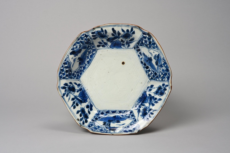 青花草花文六角皿
