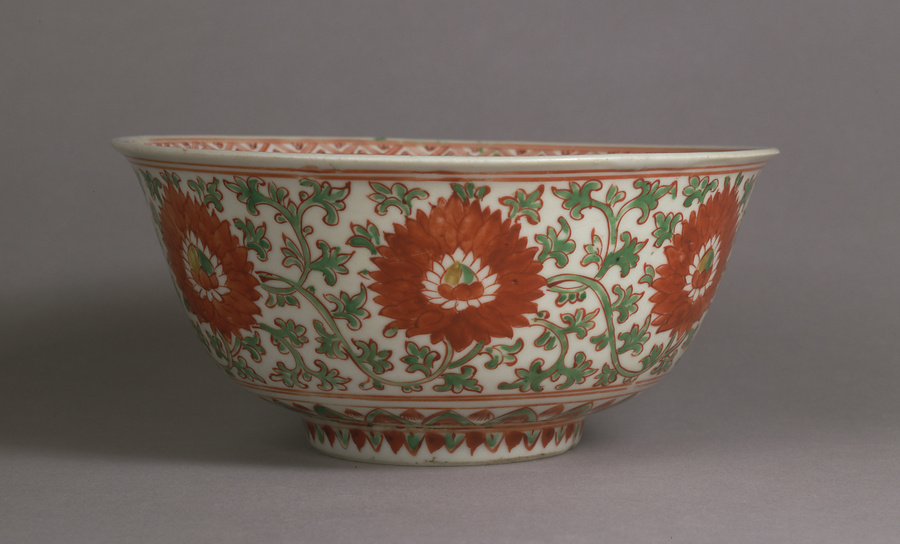 15世紀後半から16世紀にかけて景徳鎮民窯で作られた鉢です。日本では「古赤絵」と呼ばれて茶の湯の世界で珍重されました。明末万暦・天啓年間の五彩も日本の茶人を魅了しましたが、それらに比べて赤色が主体的に用いられており、典雅な文様表現が特徴です。