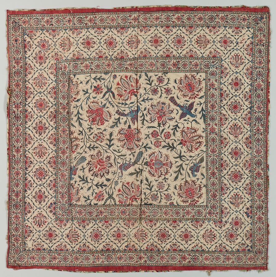 木版でありながら細くしなやかな線を表わす更紗は、ペルシャ輸出向け更紗の特徴です。花唐草の模様で埋められたデザインには、イスラーム美術の影響がうかがえます。