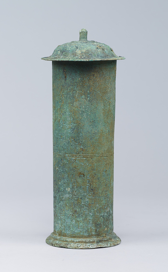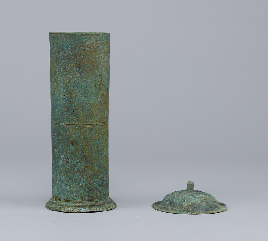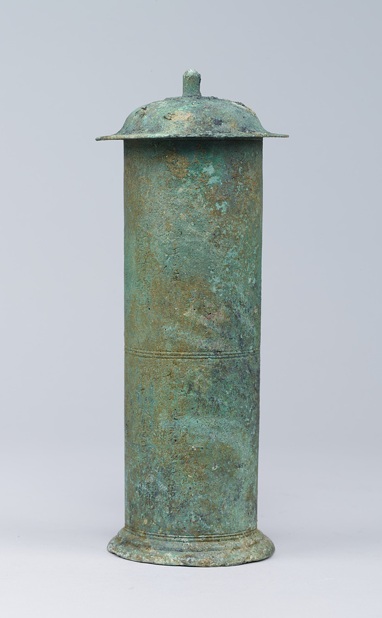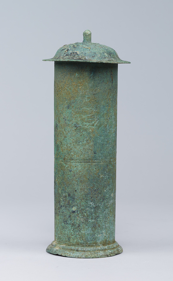 背振山経塚は福岡県と佐賀県の堺に連なる背振山の尾根上に築かれた、九州の代表的な経塚のひとつである。本経塚は銅製鋳造で、蓋に宝珠鈕がつき、底は銅板をはめ込む。身の側面に蹴り彫りで銘文が刻まれているが、内容は他の経塚出土のものとやや異なる。
