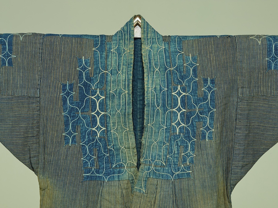 縞木綿の着物に紺木綿裂を置き、刺繍を施しています。この種のきものをツヅレなどと称しています。袖口、襟元、背、腰まわりに左右対称の文様構成で紺木綿裂を置き、いくつもの十字文を色糸を用いて刺繍により施しています。ルビ:しまもめん こんもめんぎれ ぎれ ししゅう