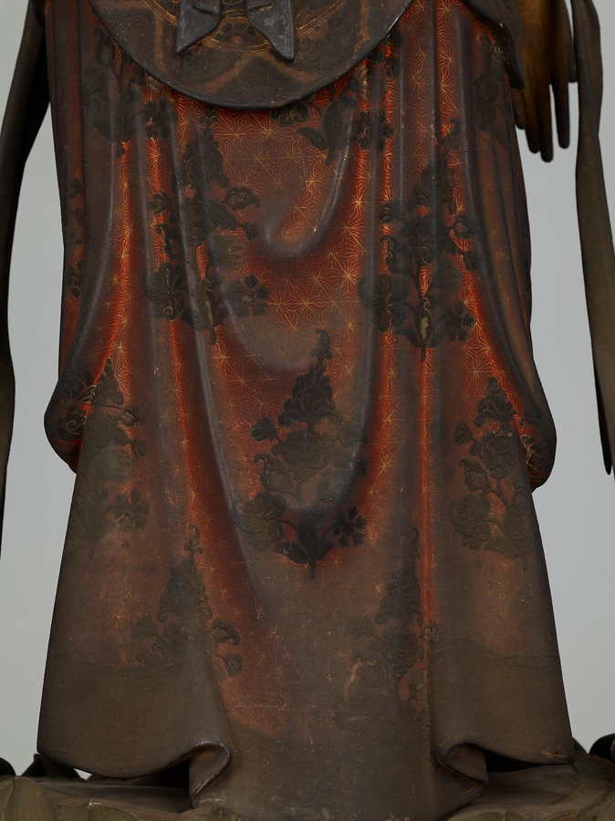 木造、金泥塗・彩色・截金、玉眼、唇に水晶