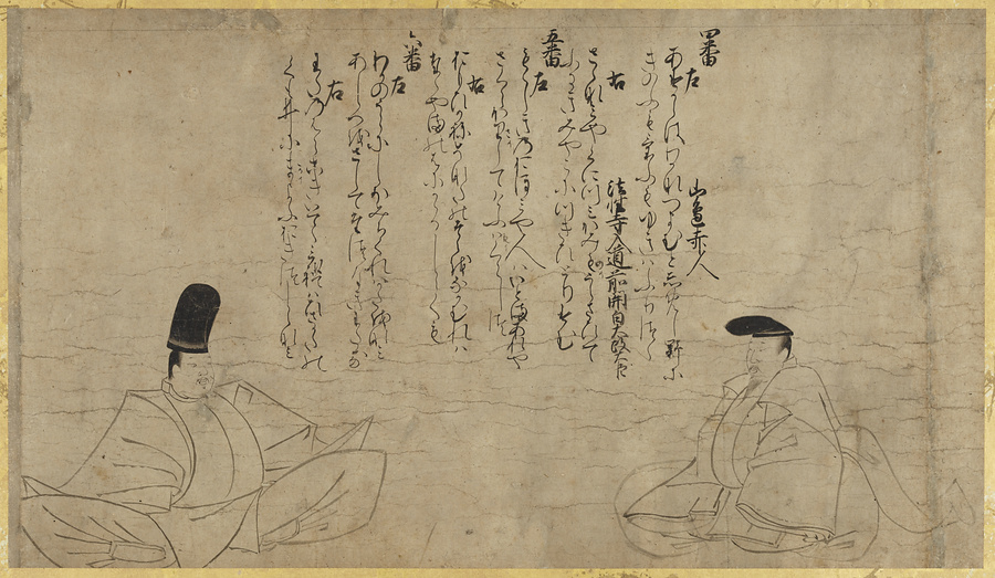 異なる時代の歌人たちを合わせた、後鳥羽*ごとば*院(1180~1239)撰「時代不同歌合」に登場する歌人たちを描く。もとは絵巻だったものを画帖に仕立てたもの。墨線のみで描かれた「白描画*はくびょうが*」で、歌人たちの顔は「似絵*にせえ*」と呼ばれるスケッチ風のタッチで描かれている。