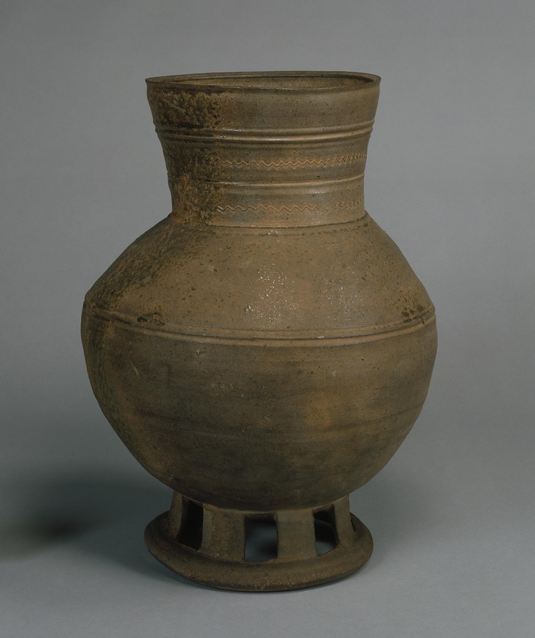 台付長頸壺は新羅土器を代表する形の一つです。この壺は5世紀末ごろのもので、頸{くび}の部分に波状文{はじょうもん}がめぐらされています。窯{かま}で焼くときに一方向から灰をかぶり、自然釉となっています。
