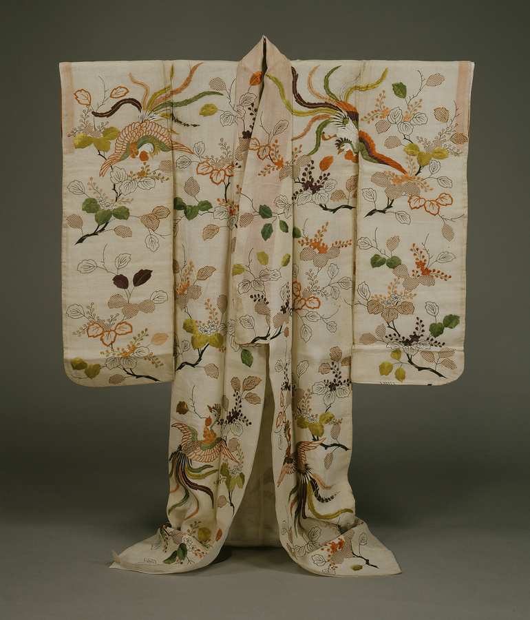 若い武家女性の夏の衣料。上質の麻布に描絵(かきえ)と刺繍、摺匹田(すりびった)(鹿の子絞りの模様を型紙で簡易に摺(す)る方法)で模様を表わす。鳳凰は中国の伝説上の瑞鳥(ずいちょう)で、桐の樹に住むとされる。吉祥模様として日本でも好まれた。内側に白麻布の重ねがつく。
