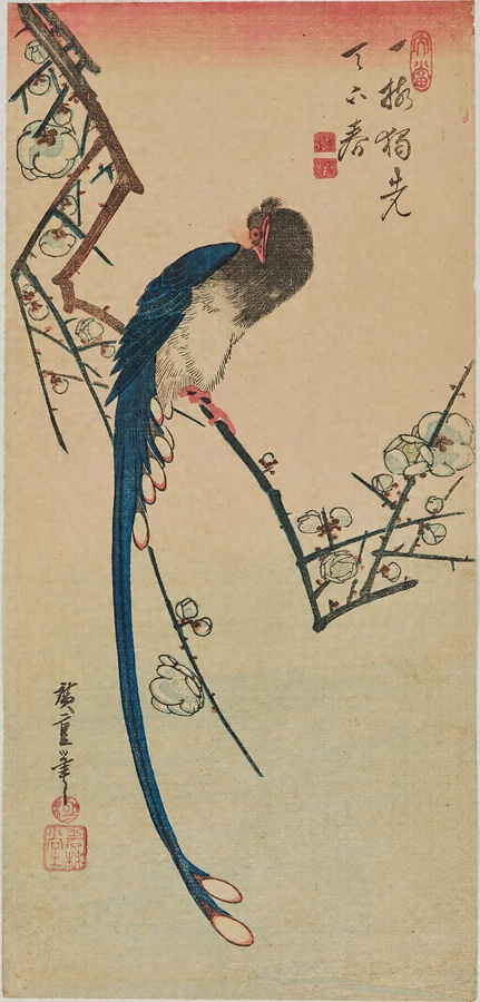 梅花に寿帯鳥