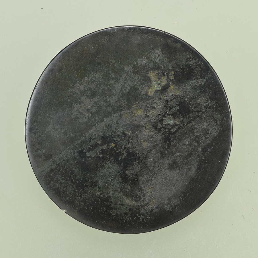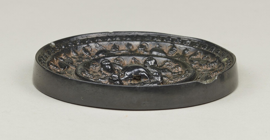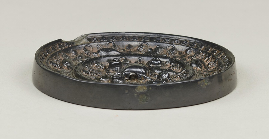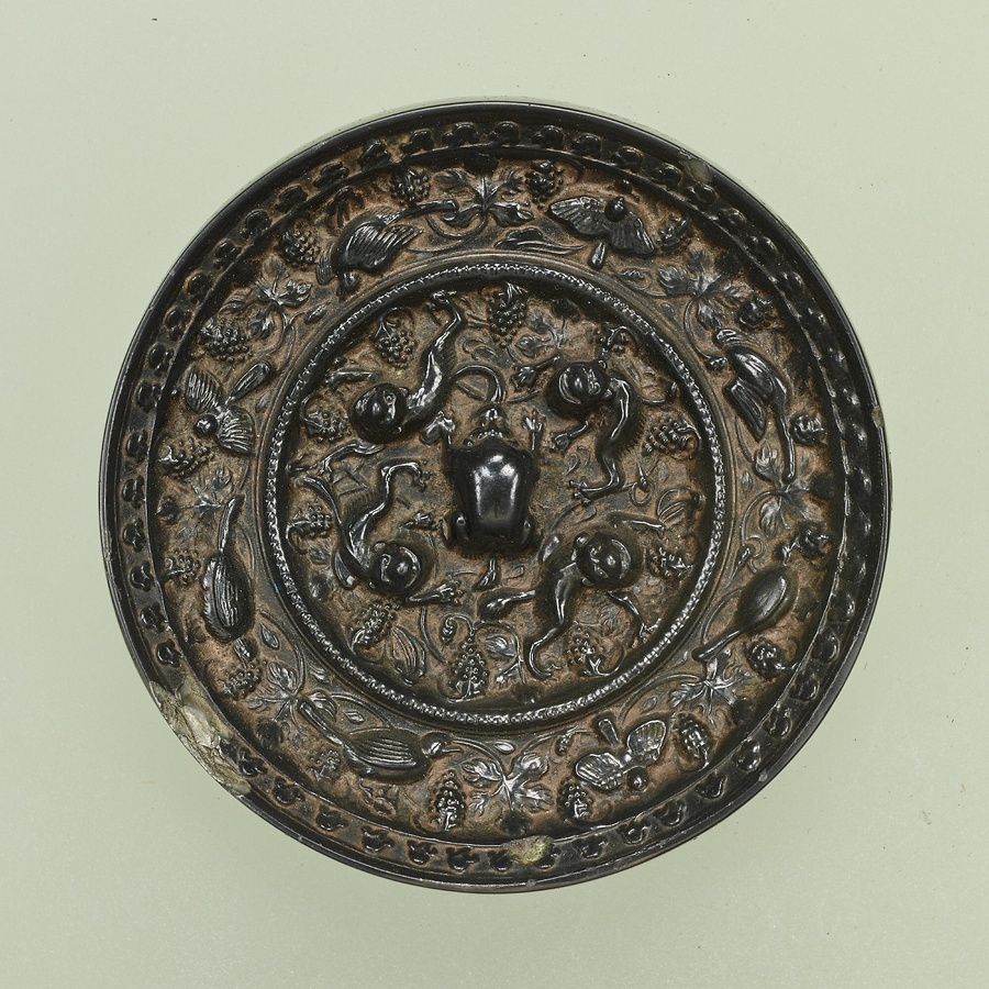獣形の鈕を中心として、鳥獣文や葡萄唐草文をにぎやかに表現する。唐時代の青銅鏡の中でも最もよく知られた形式の鏡で、小ぶりながら、その典型をよく示す。奈良県松山古墳出土の鏡とほぼ同型式で、古代の日中の交流を物語る資料の一つである。