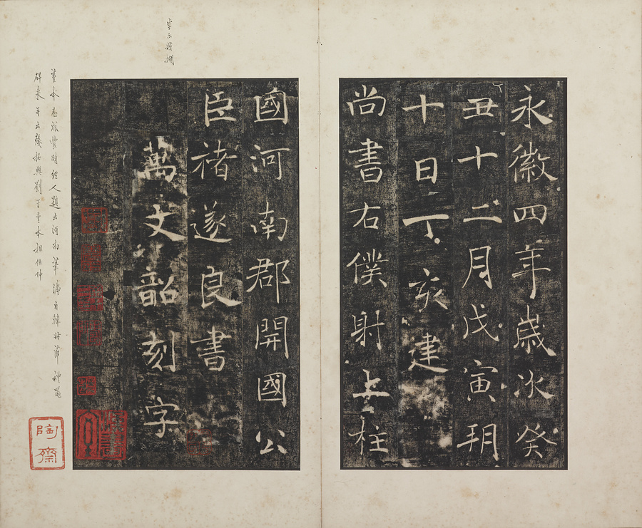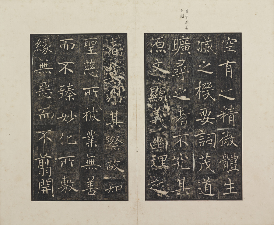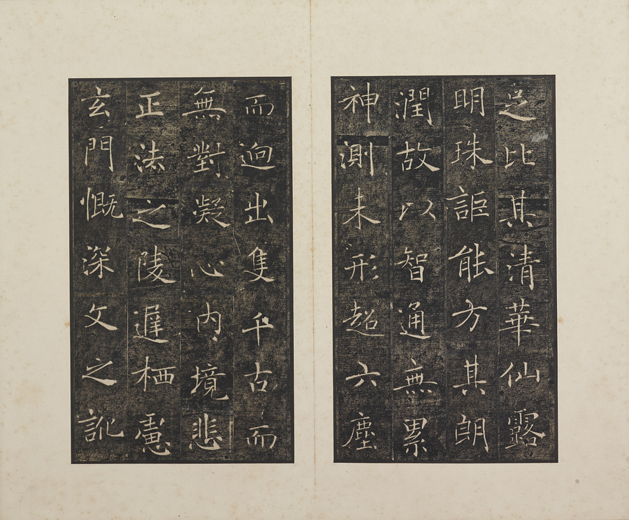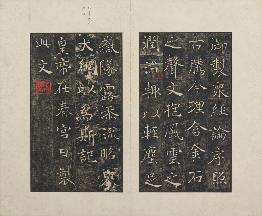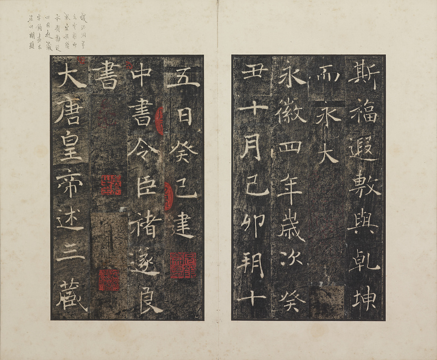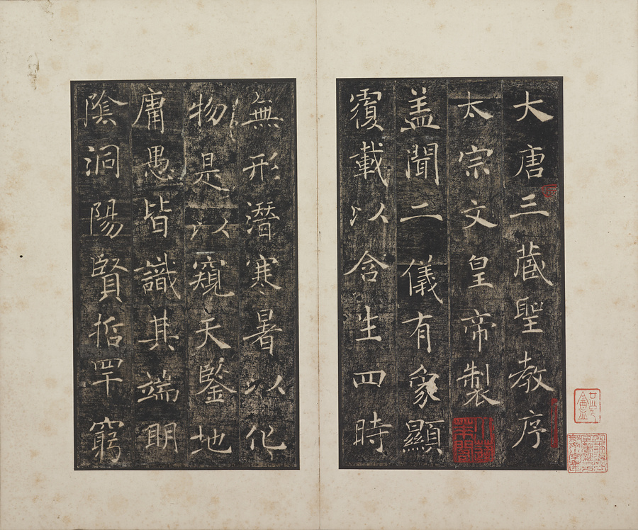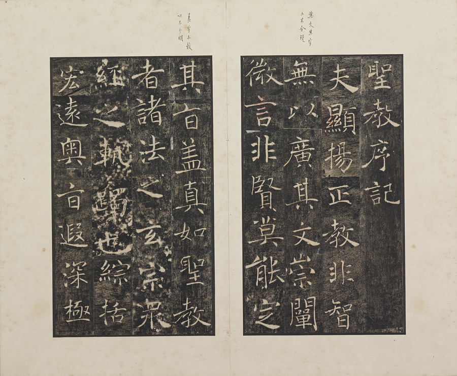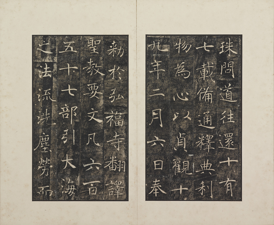 玄奘@げんじょう@が訳経に対して、唐の太宗@たいそう@と皇太子(のちの高宗@こうそう@)から賜った序と記を刻した2基の記念碑で、褚遂良@ちょすいりょう@の最晩年58歳時の書です。碑石は大雁塔(西安市)に現存します。本帖は清末民国期の徐梧生@じょごせい@、楊歗谷@ようしょうこく@らが旧蔵し、宝熙@ほうき@らの題簽、李家駒@りかく@らの跋を付します。