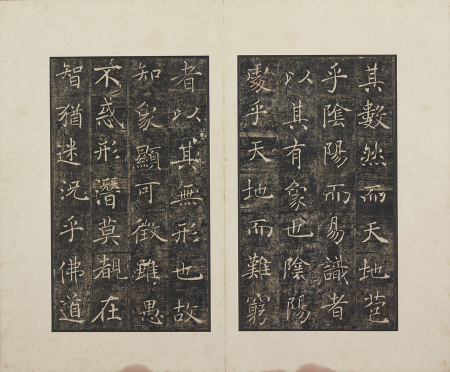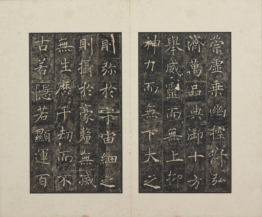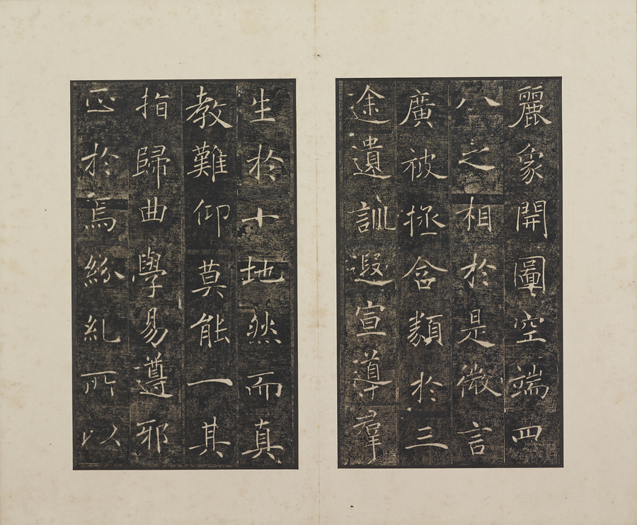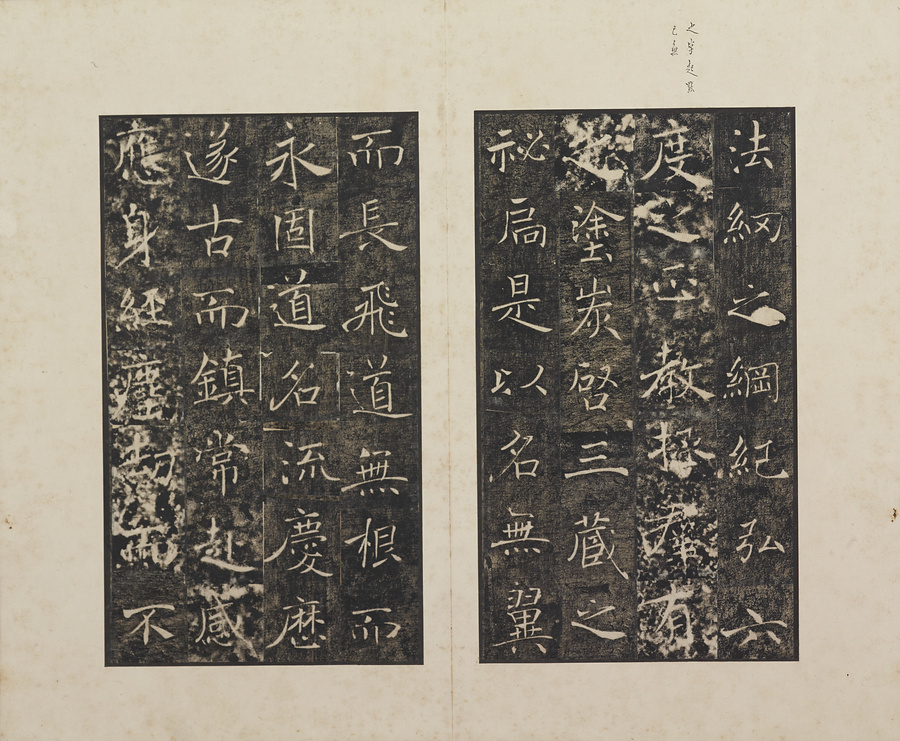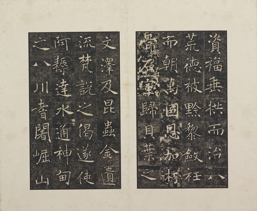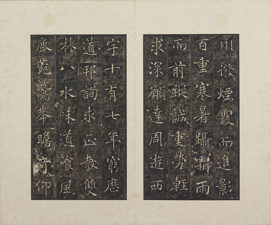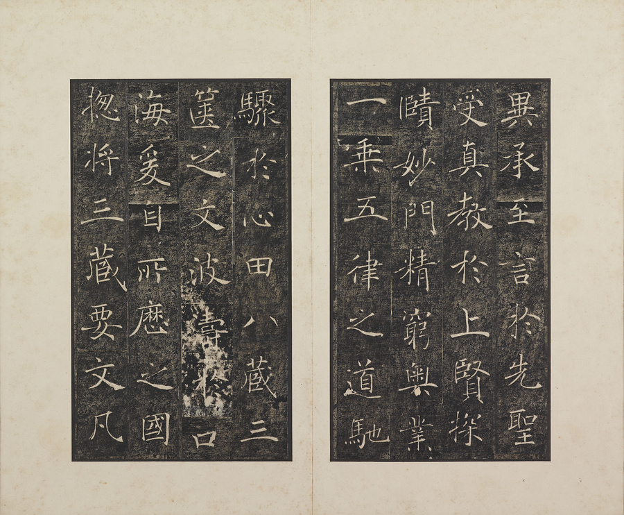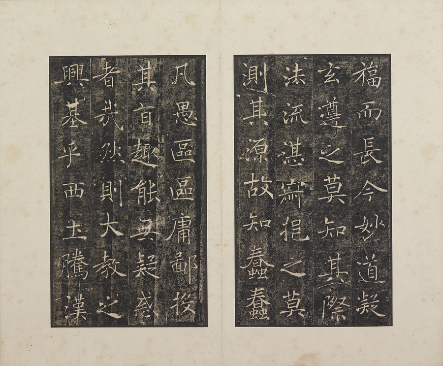 玄奘@げんじょう@が訳経に対して、唐の太宗@たいそう@と皇太子(のちの高宗@こうそう@)から賜った序と記を刻した2基の記念碑で、褚遂良@ちょすいりょう@の最晩年58歳時の書です。碑石は大雁塔(西安市)に現存します。本帖は清末民国期の徐梧生@じょごせい@、楊歗谷@ようしょうこく@らが旧蔵し、宝熙@ほうき@らの題簽、李家駒@りかく@らの跋を付します。
