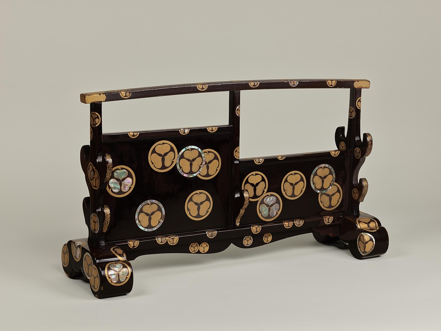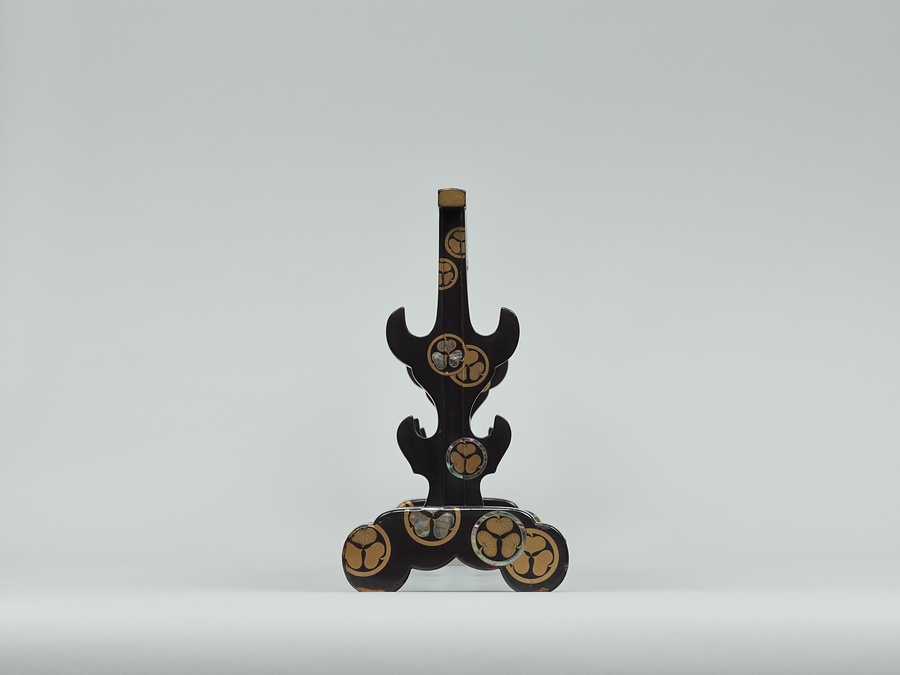 刀掛は大小の外拵が登場した安土桃山時代からみられ、一般的には外拵を柄を左側にして上下二段に掛けて用いる。江戸時代には蒔絵を施した豪華なものがみられるようになったり、これは江戸時代初期の刀掛で、黒漆の地に蒔絵と金貝(かながい)で葵紋を散らしている。(140102_h056)