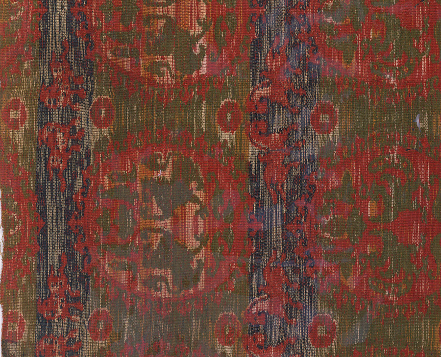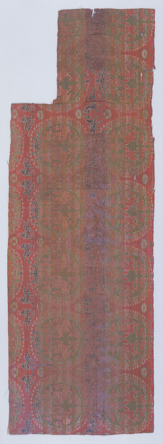 法隆寺裂を代表する経錦(たてにしき―縦方向に色糸を用い、その浮き沈みで模様をあらわした錦。八世紀以降に一般化する緯錦〈ぬきにしき〉よりも古い技法)。古代中国の蜀(現在の四川省成都市)では色鮮やかな赤地の錦が特産であったと伝えられ、これにあやかり「蜀江錦」との美称がある。連珠円文の中に向かいあった獅子や鳳凰をあらわし、外側には天馬(ペガサス)や雄鹿が疾駆する。作品内側は全体にスレ跡が目立ち、これにそって周囲に針穴が巡っていることから、本来は幡(ばん―仏教儀式の場を飾り立てるのに用いられた昇り旗)に仕立てられていたと考えられる。