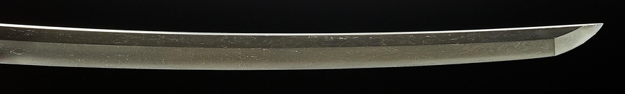 安綱は、日本刀が誕生した平安時代後期に伯耆国(鳥取県)で作刀した刀工で、代表作の国宝「名物 童子切@どうじぎり@安綱」で知られています。本品は、全体的に強く反った刀身、板目@いため@が目立つ地鉄@じがね@、複雑に変化する小乱@こみだれ@の刃文@はもん@、独特な書体の銘字@めいじ@など、安綱の作風をよく示しています。