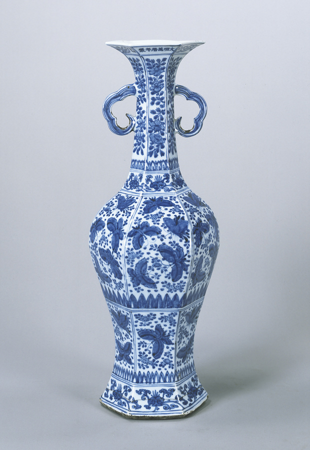 青花蝶文双耳瓶