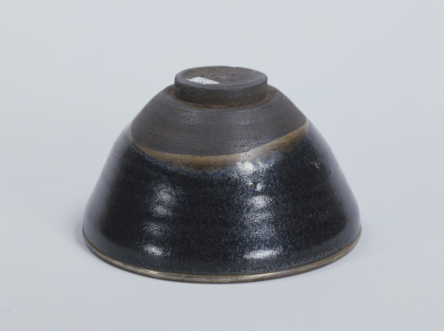作品を見てみましょう。黒い釉薬の上に、艶のない細かな灰色の斑(まだら)模様が独特の表情を作っています。釉薬のかかりは薄く、素地にろくろの跡が見えています。天目と呼ばれる茶碗のなかには、口当たりを良くするために縁を内側に一度絞って外に反らせる鼈口(すっぽんぐち)が作られたものがありますが、この作品の鼈口はやや崩れて浅くなっています。内側は広くて深く、抹茶を点てやすい形です。