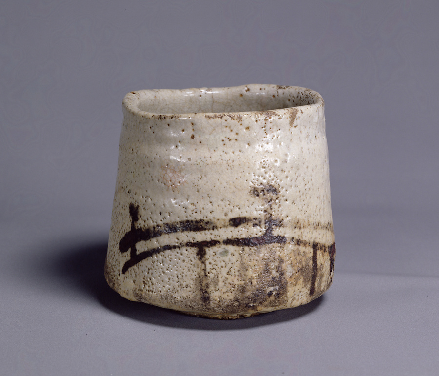 岐阜県の美濃窯でつくられた、大振りで、筒型の志野茶碗です。半透明の白い釉薬を通して見える、土の独特な色と風合いや自由奔放な絵が魅力です。この茶碗には、橋と苫屋(とまや)が描かれており、そこから「橋姫」の名前がつけられました。
