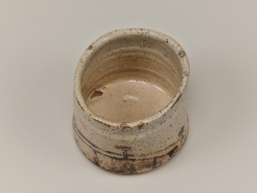 横から見ると底のほうが広がったずんぐりとした形、上から見ると、口はゆがんだ楕円形です。茶碗の鑑賞のコツは、実際に手にとってお茶を飲んだらどんなふうだろう、と想像してみること。大きく、ごつごつとして口もゆがんだこの茶碗は、手にしたときの存在感も大きく、もしかすると茶は飲みにくいかもしれません。この茶碗は、武家の間で茶の湯が盛んに行われた安土桃山時代から江戸時代初期につくられたものです。この時代の美意識を反映した、力強く自由な造形ということができるでしょう。