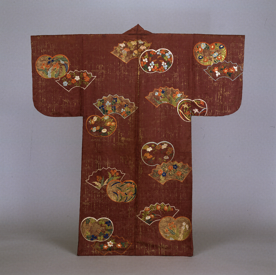 刺繍(ししゅう)と金箔で模様を表わした衣装。主として女性役が上衣に水衣(みずごろも)や長絹(ちょうけん)・舞衣(まいぎぬ)をまとった際に、腰巻として着用する。地の部分には金の摺箔で、竹模様が縞状に施されていたが、擦れ落ちてしまった。(20130820_h09)