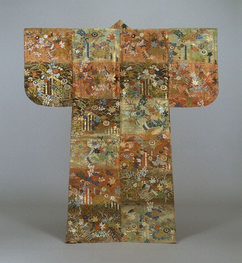 「唐」つまり中国の織物という名称だが、実際には室町時代に日本で織られた縫取織(ぬいとりおり)で、刺繡(ししゅう)のような風合いが特色である。江戸時代にはもっぱら能舞台で女性役を演じる際の小袖に使用された。「里の女」を演じる際には衿(えり)を開き立てて着流しで着用する。