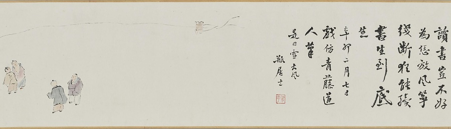 翁同龢【おうどうわ】、字は叔平、号は松禅、瓶笙、瓶庵居士など。咸豊6年(1856)の進士で、翰林院修撰を授けられ、同治帝、光緒帝、二代の師としても知られる大官。光緒帝は西太后の手を離れて、光緒15年(1888年)より親政をはじめ、光緒20年(1894年)には日清戦争がおこった。『翁同龢日記』によれば、この日北京は前日からの大雪に見舞われ、朝方に降りやんだという。紫禁城から退朝する際、翁同龢は階段で足を滑らせ転んでしまったという。その後邸宅に帰って描いたのが本図である。風のなかに凧あげをする子供たちの姿は、まことに平和な日常そのものである。(20110308_h21)