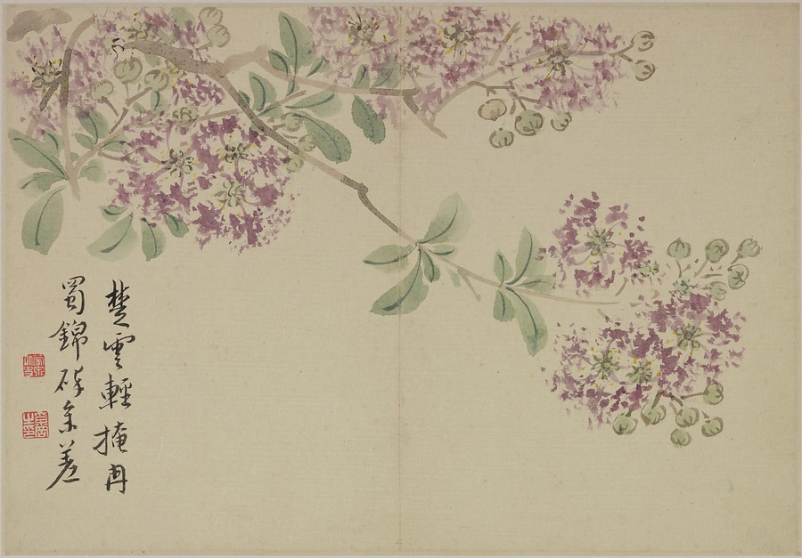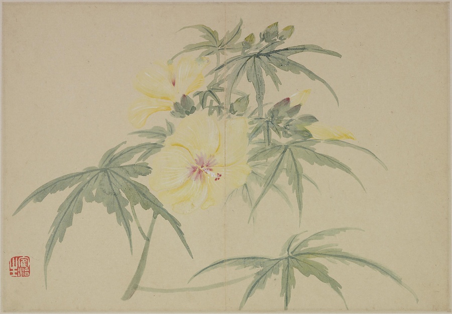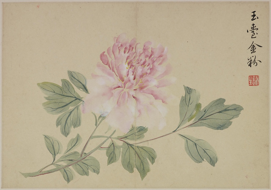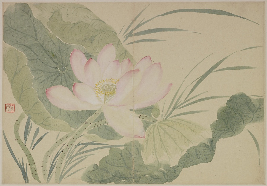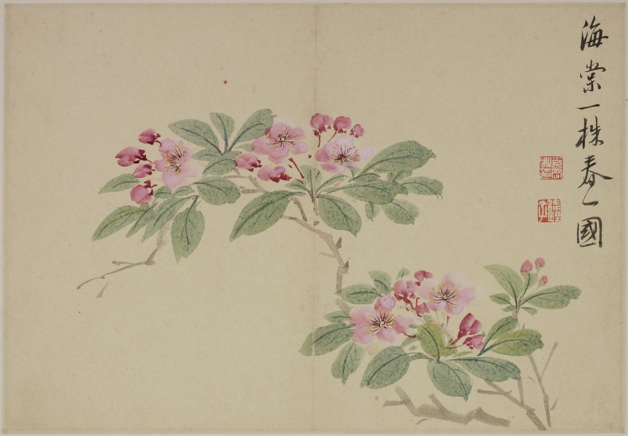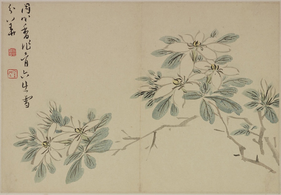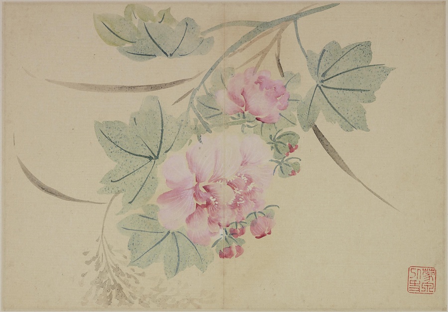 奚岡@けいこう@(字・純章、号・鉄生)は、歙県(安徽省)出身で、詩書画印をいずれも善くしました。本冊では、輪郭線のない没骨法@もっこつほう@で、水気のある墨と淡彩を巧みに用い、牡丹や蓮花、海棠@かいどう@などの様々な草花を表現しています。(植松氏執筆)(180417_t081)