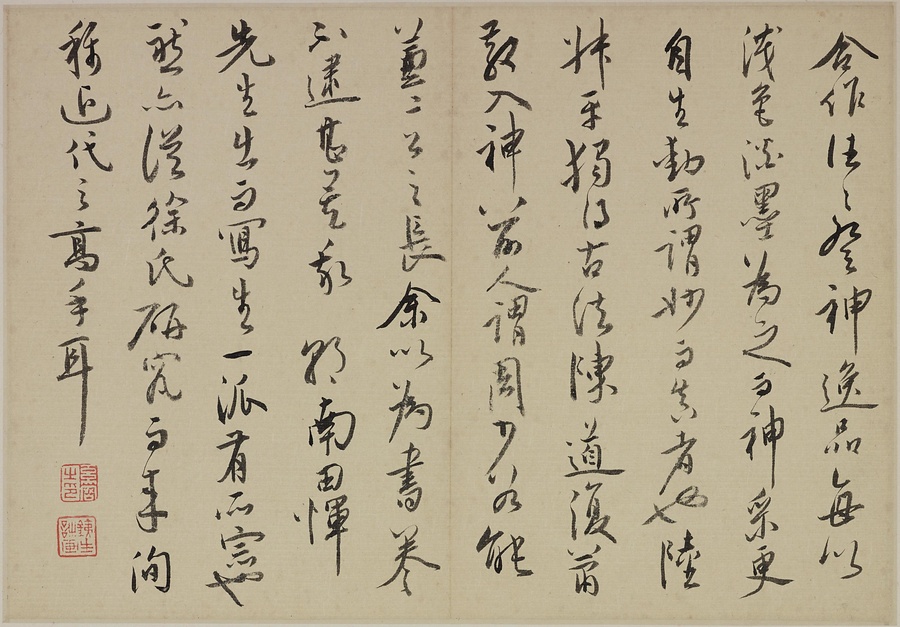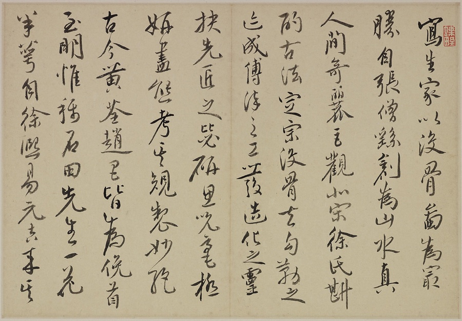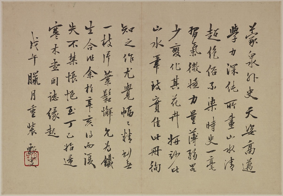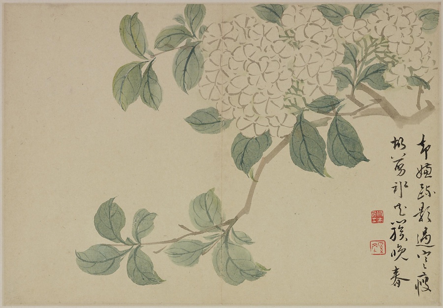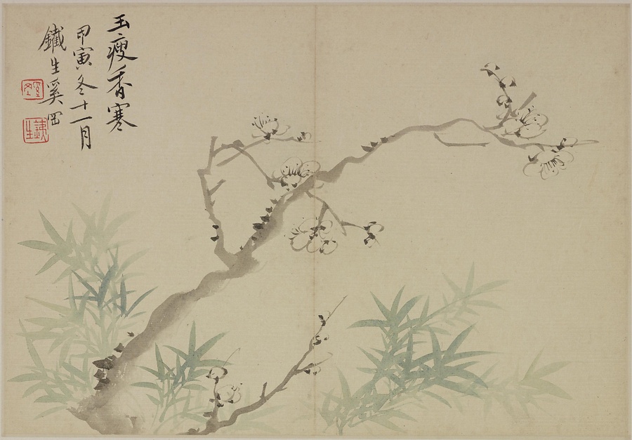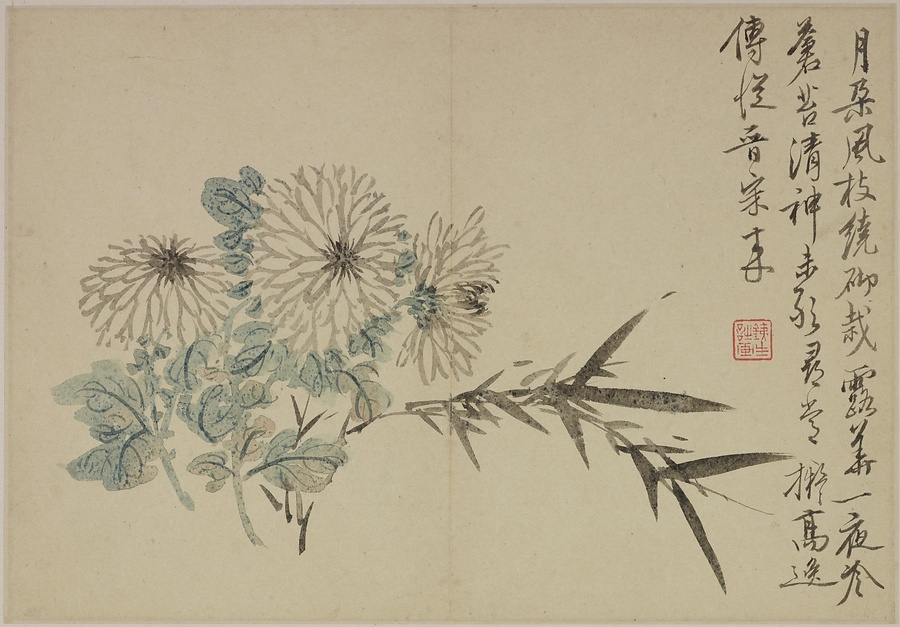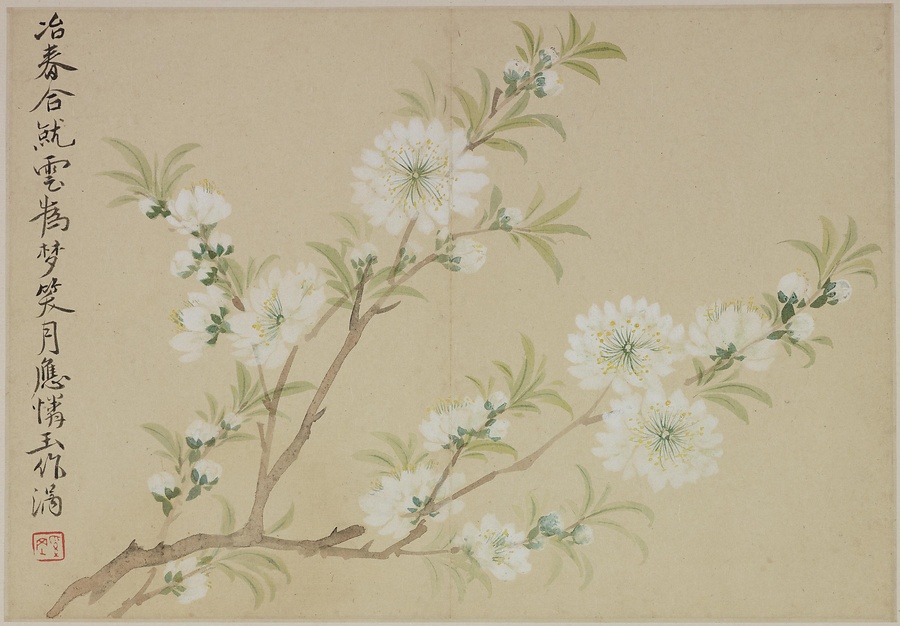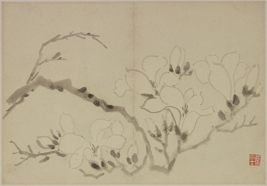 奚岡@けいこう@(字・純章、号・鉄生)は、歙県(安徽省)出身で、詩書画印をいずれも善くしました。本冊では、輪郭線のない没骨法@もっこつほう@で、水気のある墨と淡彩を巧みに用い、牡丹や蓮花、海棠@かいどう@などの様々な草花を表現しています。(植松氏執筆)(180417_t081)