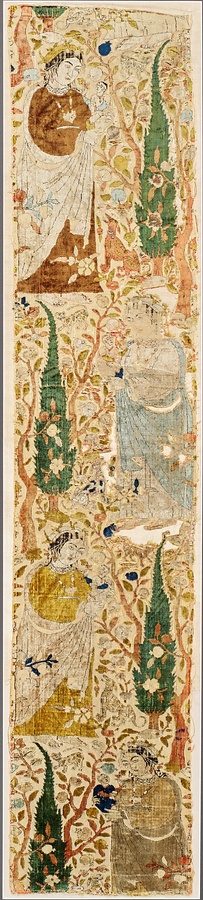 糸杉や柘榴といった意匠はペルシャ風ですが、その脇に大きく表された母子は聖母マリア像を思わせます。イスラム圏のクリスチャンからの注文で織られたのかもしれません。色味を美しくするために経糸の色を継ぎ替えて織られ、高度な技術がうかがえます。