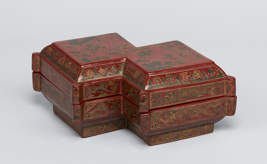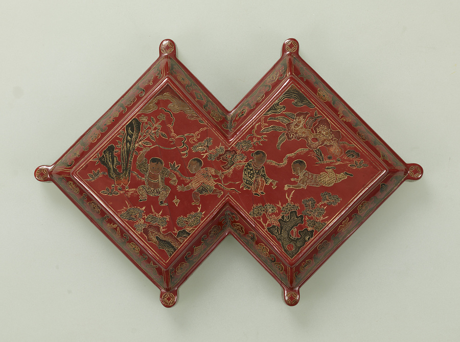 この箱のような菱形を繋いだ形は方勝(ほうしょう)といい、吉祥を表わす器形です。文様は緑・茶・黒などの色漆を嵌入し、文様の輪郭を鎗金(そうきん)の技法で表わす手法がとられており、明時代の存星の華麗で力強い作風が出ています。底裏に「大明嘉靖年製」という銘があります。(130102_t091)