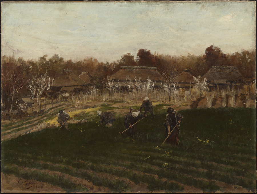 この作品を描いた浅井忠は明治時代に活躍した画家で、日本で最初に設立された官立の美術学校である工部美術学校(こうぶびじゅつがっこう)で西洋画を本格的に学びました。この作品は、農村という題材や褐色を基調にした色彩に、同校で指導をしていたイタリア人画家のアントニオ・フォンタネージからの強い影響がうかがえ、描かれた人物は当時外国人向けに販売されていた写真がもとになっています。題材や色調は浅井がほかから影響を受けた表現ですが、安定感のある構図などは浅井自身の高い技量を示しています。『春畝』は、日本で最初の洋風美術団体である明治美術会の第1回展に出品され、わが国において西洋絵画がいかに成熟したかを示すことになりました。