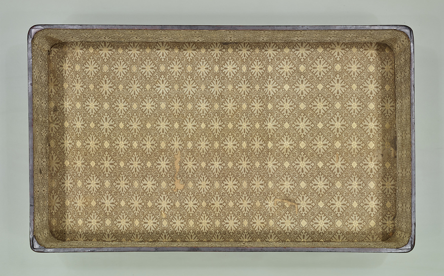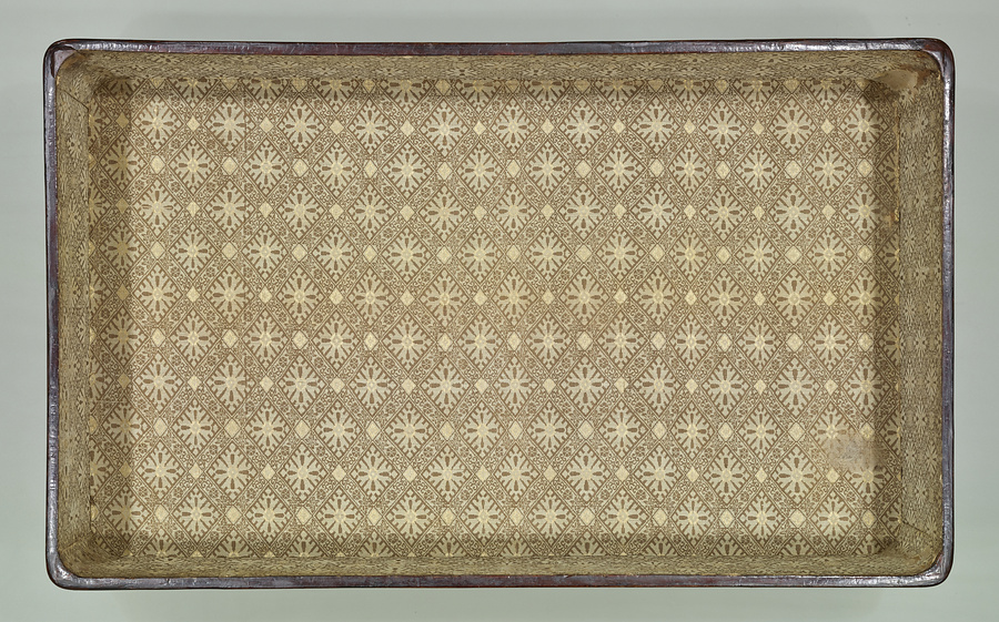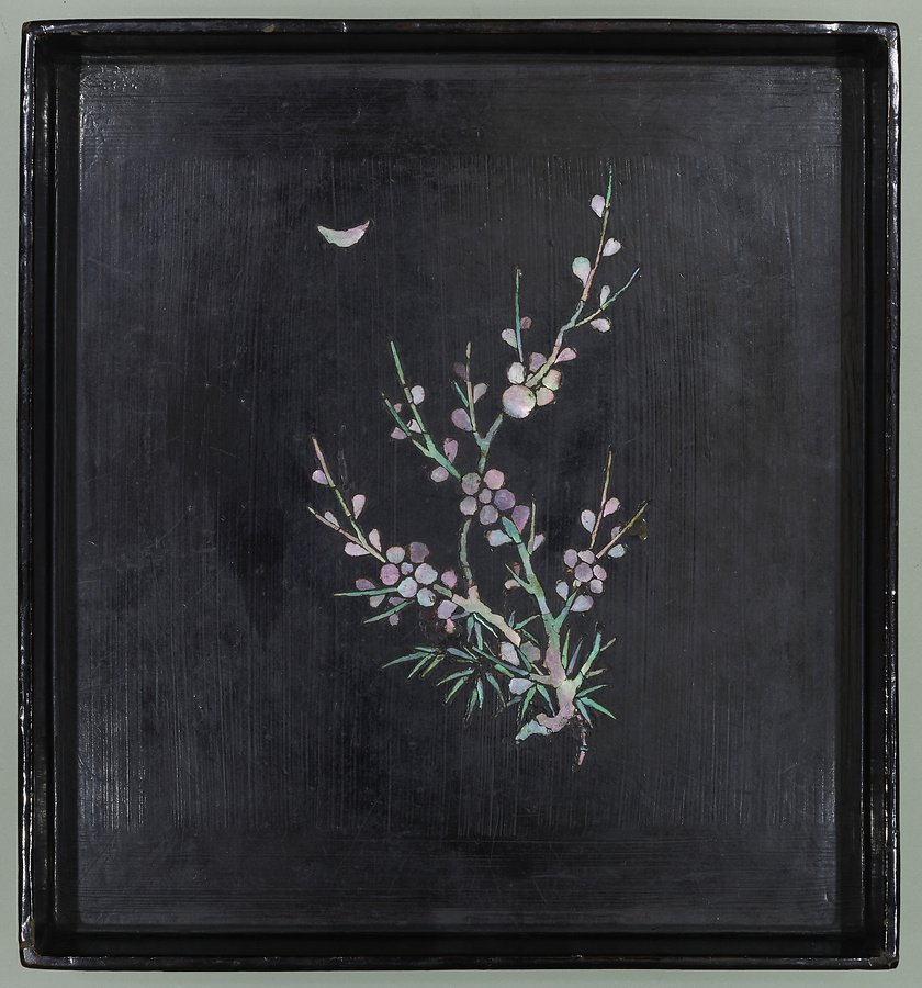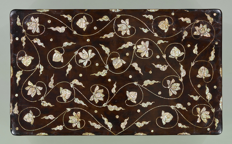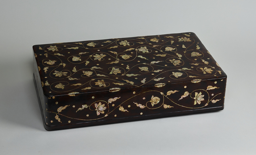朝鮮の官服をおさめるための衣装箱と考えられる。毛利家に伝来した。金色に輝く牡丹唐草文は、鮑の研出法であらわされている。貝片を割ってひびの文様を生かす割貝法が用いられており、朝鮮時代の螺鈿の特色がよくあらわれている。