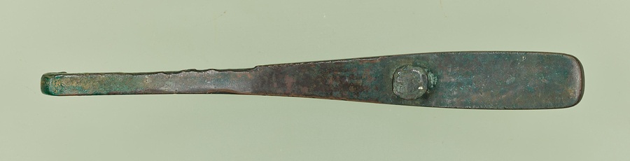 帯鉤とはベルトのバックルに相当する古代中国の帯留めです。帯鉤裏面にあるボタン状突起にベルトの一端を取りつけ、腰に回したベルトのもう一端を帯鉤の鉤に引っ掛けて使います。象嵌や鍍金銀を駆使した青銅製のほかに玉製のものもあり、多彩な材質技法が駆使されました。(帯鉤TJ-5851 玉帯鉤、TJ-5852 絡獣形帯鉤、TJ-5854 羽渦文帯鉤、TJ-5857 獣面文帯鉤、TJ-5858 雲気文帯鉤、TJ-5859 楕円獣形帯鉤、TJ-5861 夔龍形帯鉤併用)