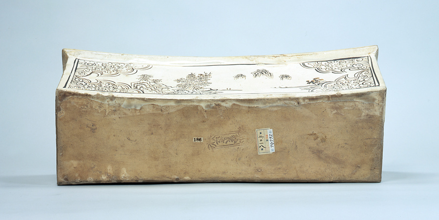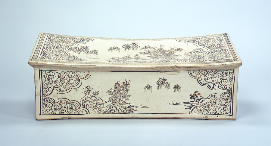 枕は磁州窯を代表する主要製品の一種で、多くは実用のものでした。元時代になると磁州窯では鉄絵で物語や風景の一場面、吉祥の動植物を描いた器が主流になります。この枕は、上面と正面、背面に山水文を、両脇側面には窓枠をもうけて花文を巧みな筆線であらわしています。
