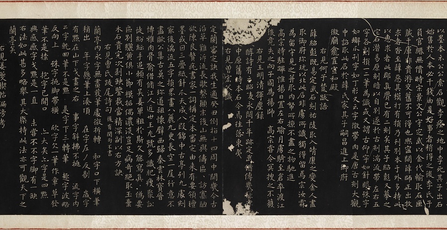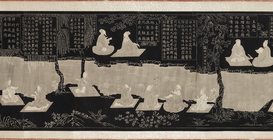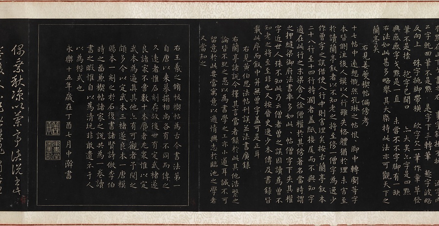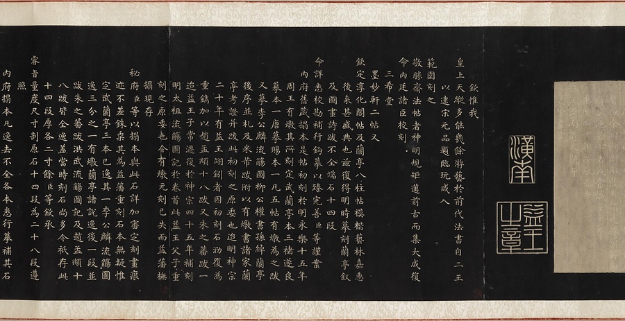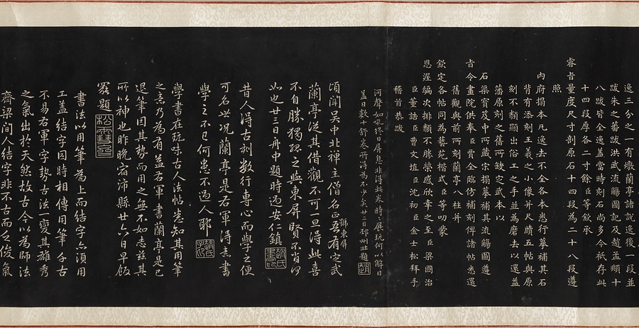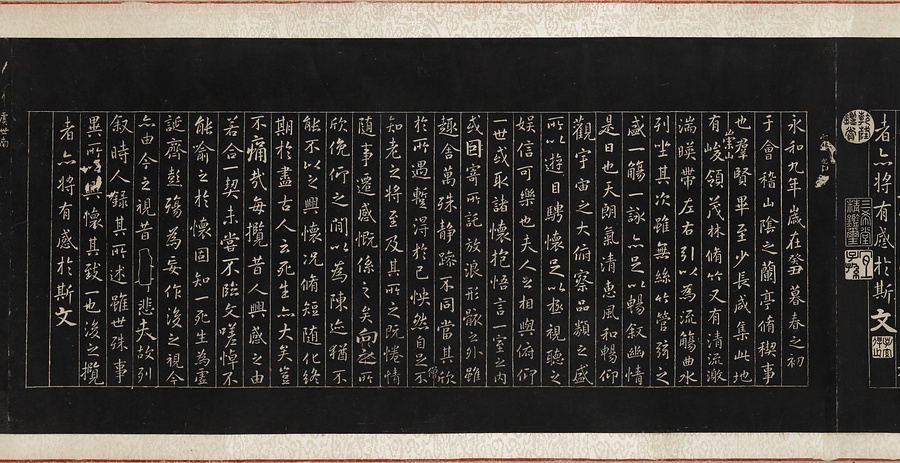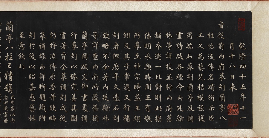諸種の蘭亭序@らんていじょ@5帖と、流觴曲水@りゅうしょうきょくすい@の詩会を表した蘭亭図、東晋の孫綽@そんしゃく@(320~377)の後序、そのほか蘭亭の関連資料を集刻した1巻。清の乾隆帝@けんりゅうてい@が臣下に命じて、内府に残存する明時代の刻石をもとに考証させ、不足部分を補刻し、乾隆帝の御旨@ぎょし@や七言律詩の御制詩注@ぎょせいしちゅう@などを新たに追加して刊行したものです。