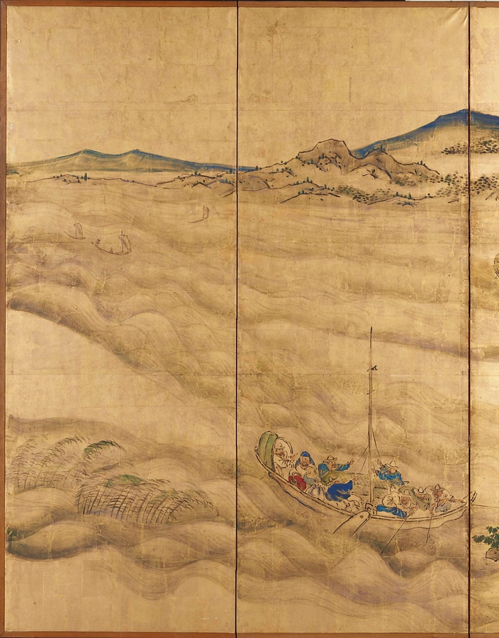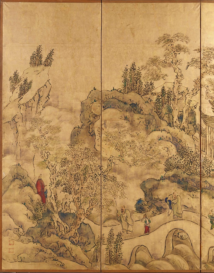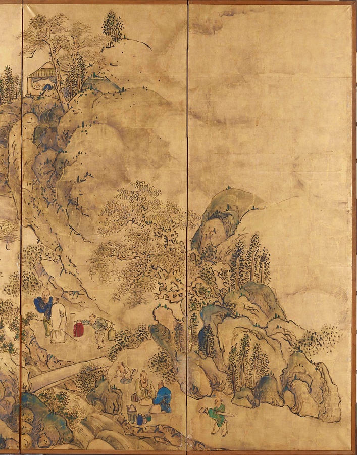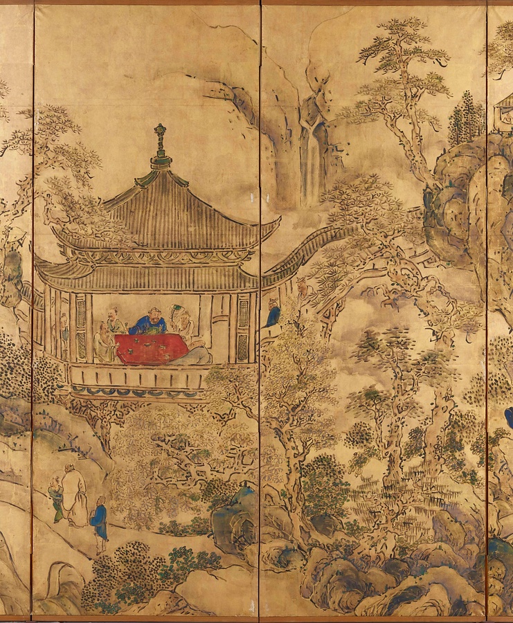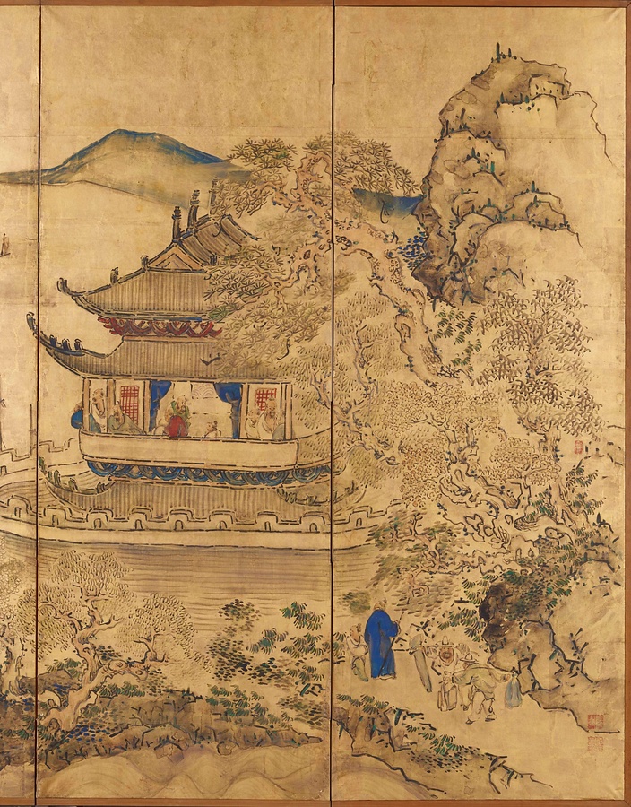 中国の景勝地の対。右隻は孟浩然@もうこうねん@・李白@りはく@ゆかりの、洞庭湖@どうていこ@を眺望する岳陽楼@がくようろう@、左隻は欧陽修@おうようしゅう@が安徽省琅琊山@あんきしょうろうやさん@に建てた酔翁亭@すいおうてい@。大雅は、清代の画帖を参考に描いた。原図より建物や人物を大写し、群青や朱など鮮やかな色で服を彩って金地に輝く文人生活を映し出している。