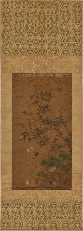 大きく回転しながら伸びる竹が印象的な作品です。強い生命力を持つ竹、子宝(こだから)を象徴する瓜(うり)、立身出世(りっしんしゅっせ)を意味する鶏頭(けいとう)は、いずれもめでたい植物と考えられてきました。また草花の間には、蝶やトンボ、イナゴ、鈴虫、クツワムシなどが生き生きと描かれ、自然の活力を伝えています。北宋時代11世紀ころ、花鳥画を得意とした宮廷画家、趙昌(ちょうしょう)が描いたと伝えられてきました。