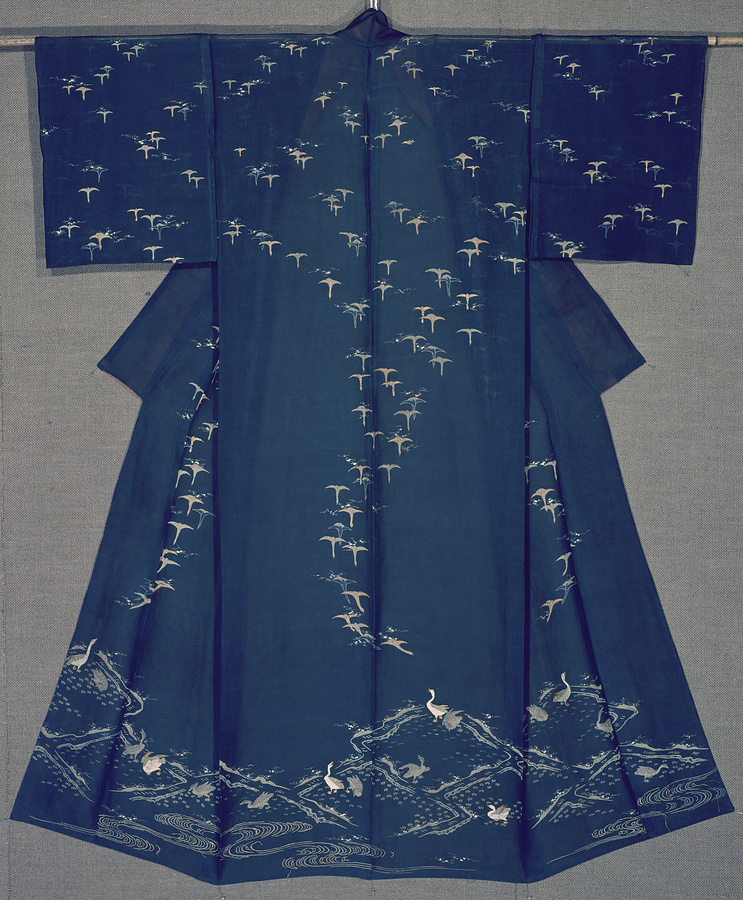 現代の感覚では意外かもしれないが、江戸時代の夏のきものには、涼を呼ぶためだろうか、晩秋や冬の意匠がしばしば見られる。この一領も、そのひとつ。藍鉄色と呼ばれる暗い青緑色の地色に、稲穂を刈り取った後の冬田に舞い降りる雁の一群を、白上げと刺繡であらわしている。