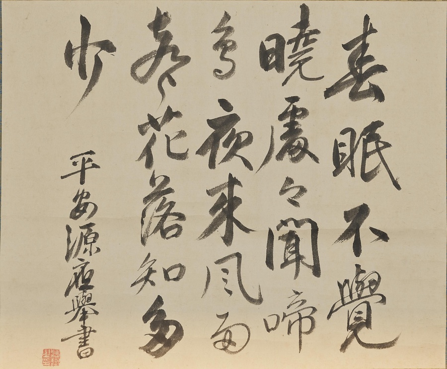 「春眠不覚(春眠暁を覚えず)」にはじまる唐代の詩人・孟浩然@もうこうねん@の詩「春暁」です。江戸時代中期(18世紀)の画家・円山応挙による書です。署名に源とあることから、藤原姓から源姓にかえた50歳頃の作品と考えられます。淡い墨色と柔らかな筆線が調和し、春の穏やかさを感じさせます。