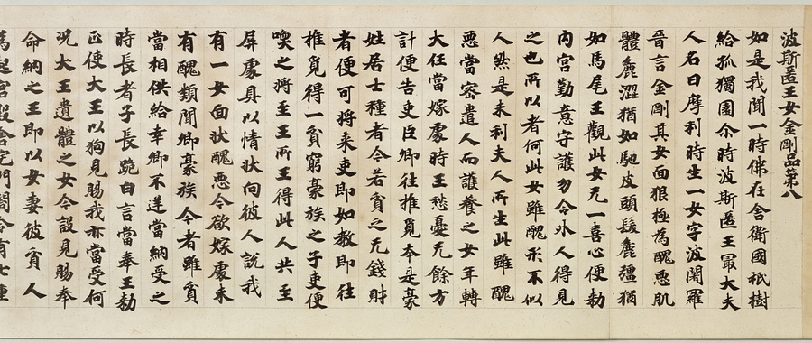 『賢愚経』は中国北魏(ほくぎ)の慧覚らの漢訳した、賢者・愚者に関する小話を収めた経典。本巻は「波斯匿王女金剛品(はしのくおうにょこんごうぼん)第八」「金財品(こんざいぼん)第九」「華天品(かてんぼん)第十」「宝天品(ほうてんぼん)第十一」を書写する。聖武天皇筆と伝えるが確証はない。「大聖武」とも称され王者の風格を備えている。(20140325_h012)