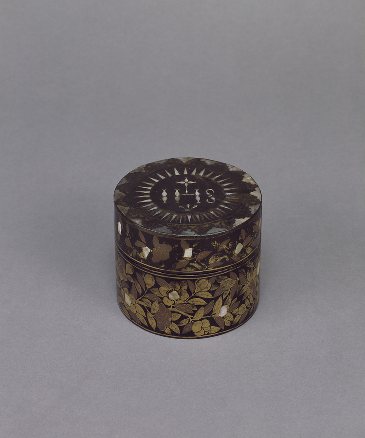 これは、カトリック教会の聖餐式に用いる聖餅箱、すなわちイエスの肉体を象徴するパンを収納する容器である。IHSはイエスの名を表す記号。これを光の輪で囲み、Hの文字に十字架を立て、三本の釘を刺したハートを添えた意匠は、天文十八(一五四九)年に来日したフランシスコ・ザビエルの属するイエズス会の紋章である。西洋人が祖国に持ち帰った初期の輸出漆器の中でも、聖餅箱は、世界で十数例ほどしか確認されておらず貴重である。