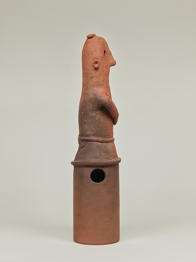 ポカンとあいた目と口の愛らしい表情と、左手をあげたポーズから「踊る人々」の愛称で知られる埴輪です。埴輪は古墳の上や裾、周堤にたてられた土で造られたやきものです。筒形の円筒埴輪を基本にして、家や道具類、武器・武具・船、のちに人物や動物などさまざまなカタチのものが加わりました。