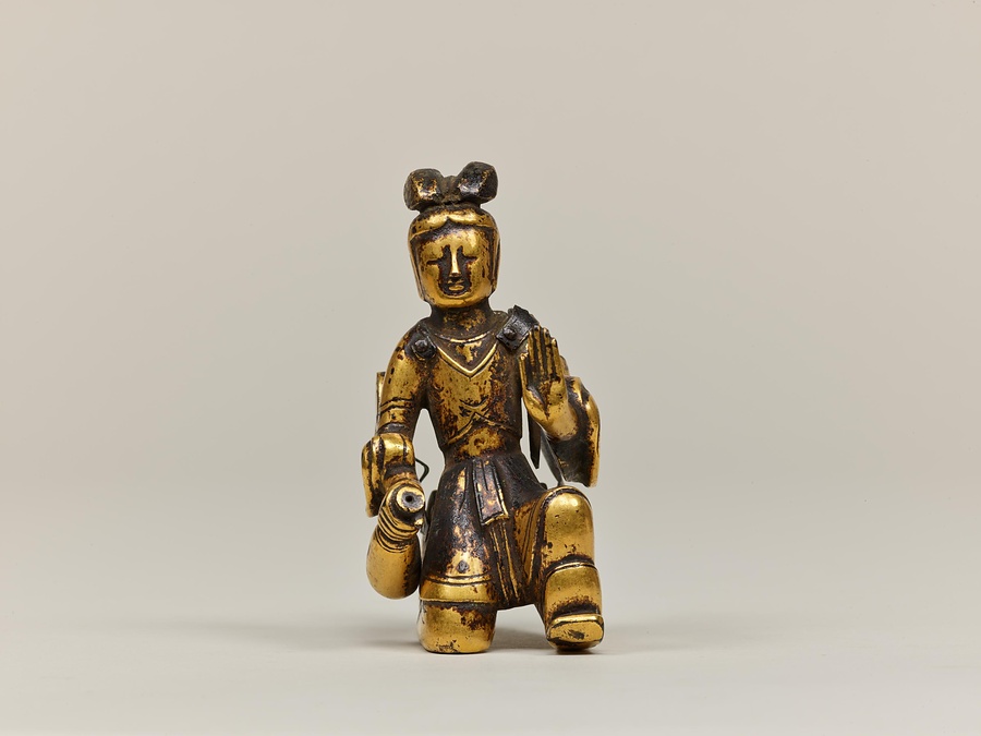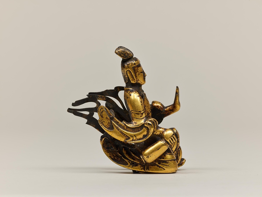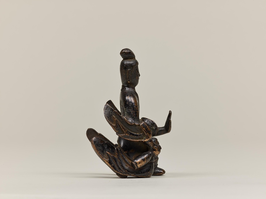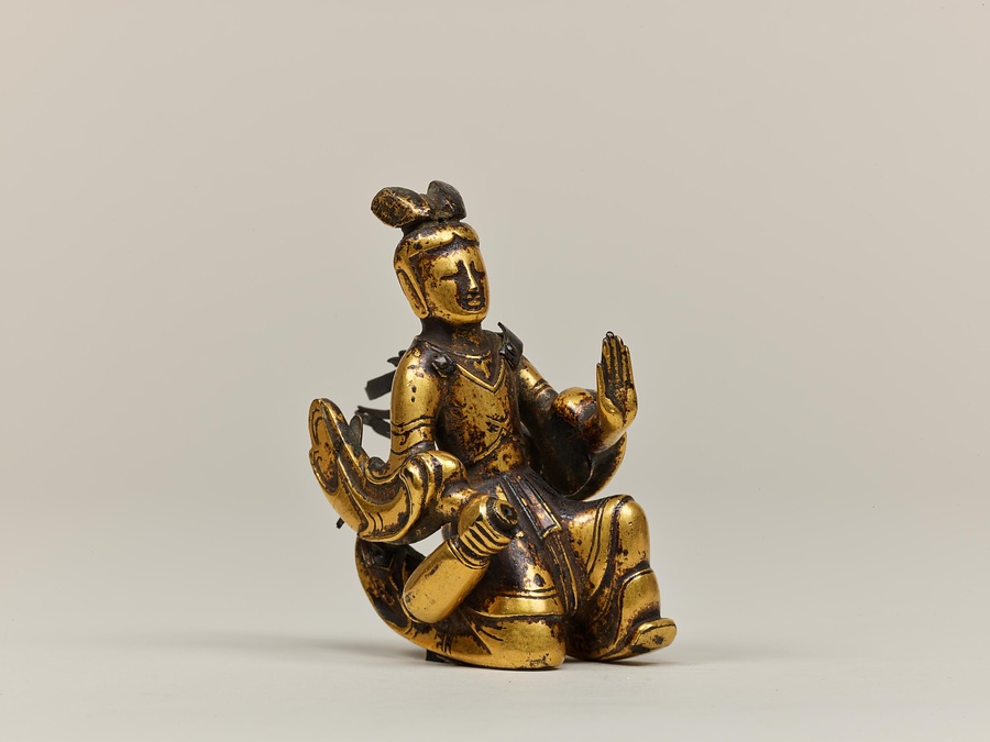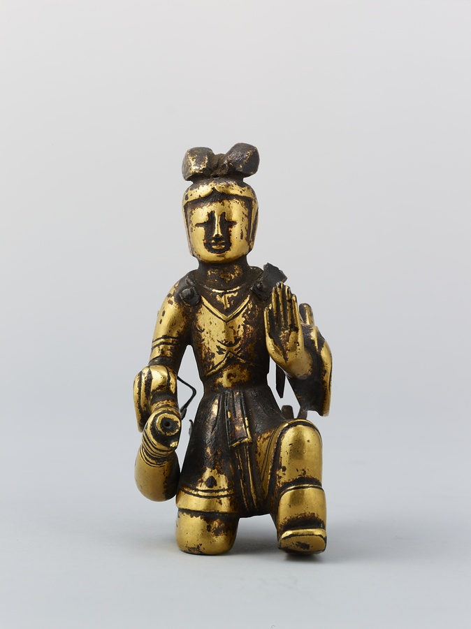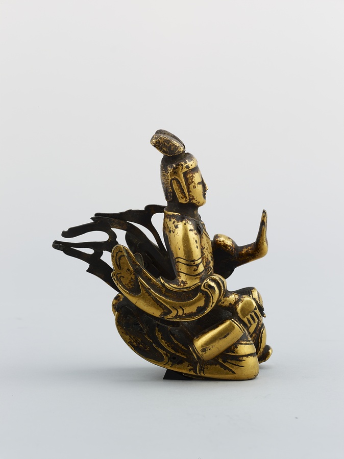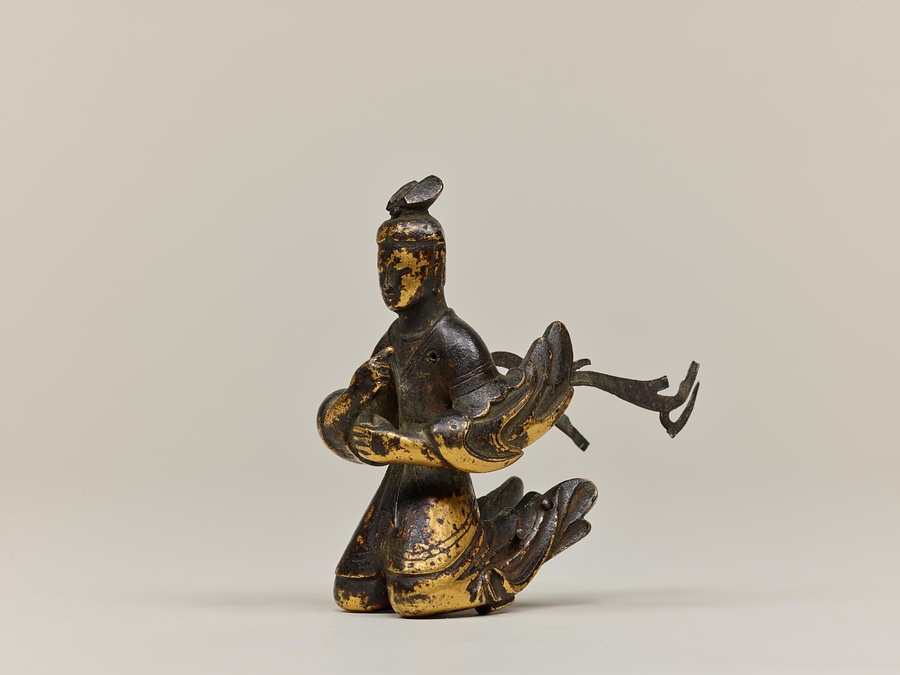 お釈迦様の母、摩耶夫人(まやぶにん)がお釈迦様を生むその瞬間を表した珍しい作品です。シャカ族の王妃であった摩耶夫人は、出産を前にルンビニー園という花園を訪れます。そこで花の咲いた無憂樹(むゆうじゅ)という木の枝に手をかけたとき、右脇からお釈迦さまが生まれました。お釈迦さまは生まれてすぐに7歩あるき、世界のすべての人々を救うために生まれてきたことを宣言します。その時、梵天(ぼんてん)や帝釈天(たいしゃくてん)といった神々は香りのよい水をお釈迦様に注ぎ、その身体を洗ったと伝えられています。