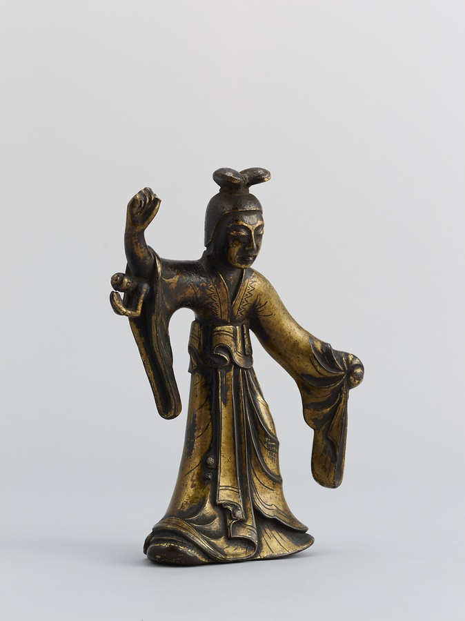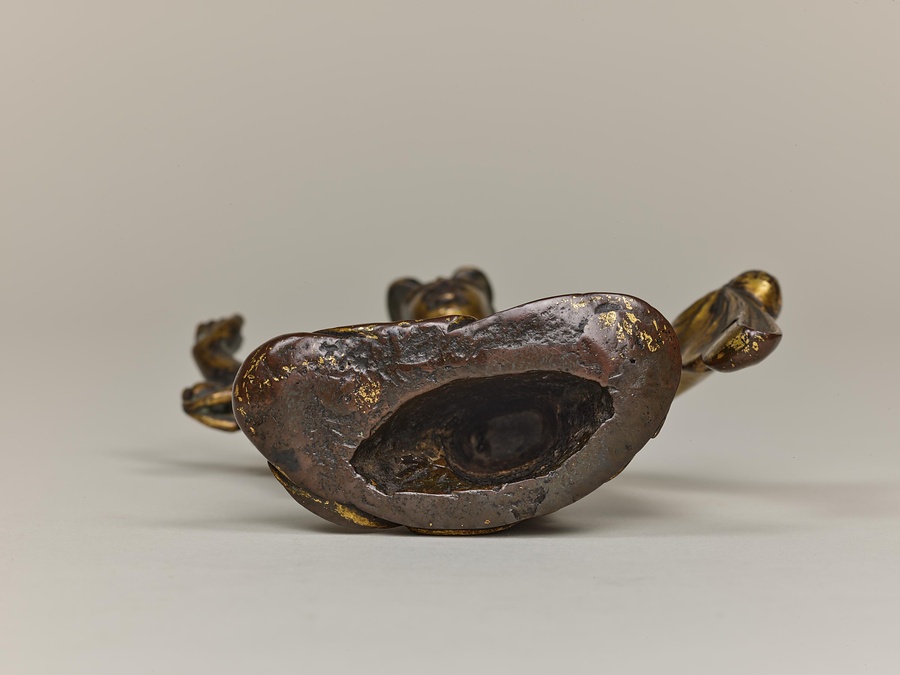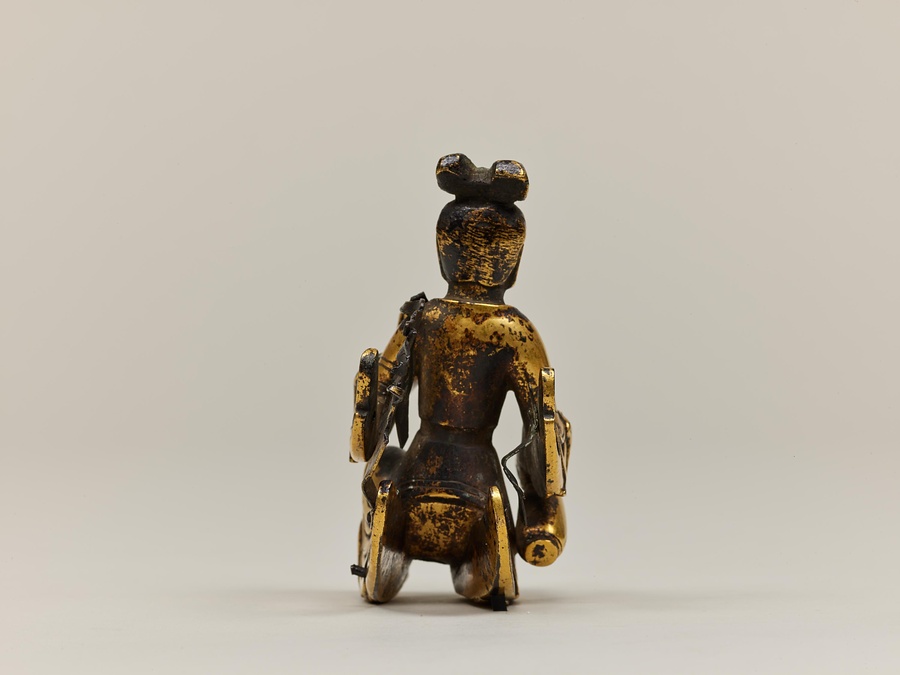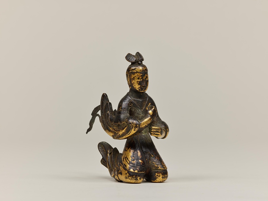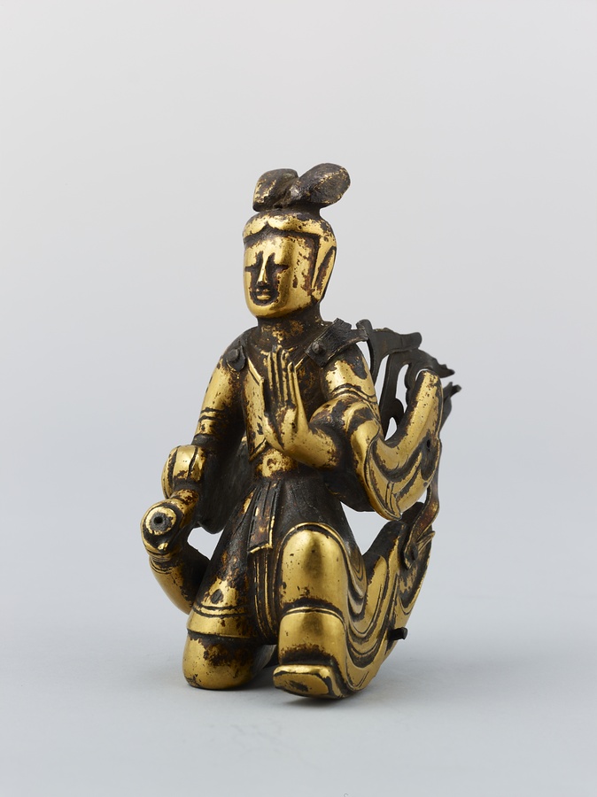 作品を見てみましょう。摩耶夫人は右手を伸ばし、枝をつかむ仕草をしています。足を踏ん張り、左手を衣ごとかたく握っているのは、出産のために力を入れているのでしょう。右脇を見ると、小さなお釈迦様が合掌しながら生れ出ています。その周りには手に水の入った瓶(びん)などを持つ天人たちの像もあります。天人像の底には湾曲した棒が残っているものがあり、もとは宙に浮くように置かれていたと考えられます。この世にお釈迦様が生まれたことをお祝いする4月8日の誕生会(たんじょうえ)で、仏像に水などを注いで洗い清める灌仏に使われた仏像です。