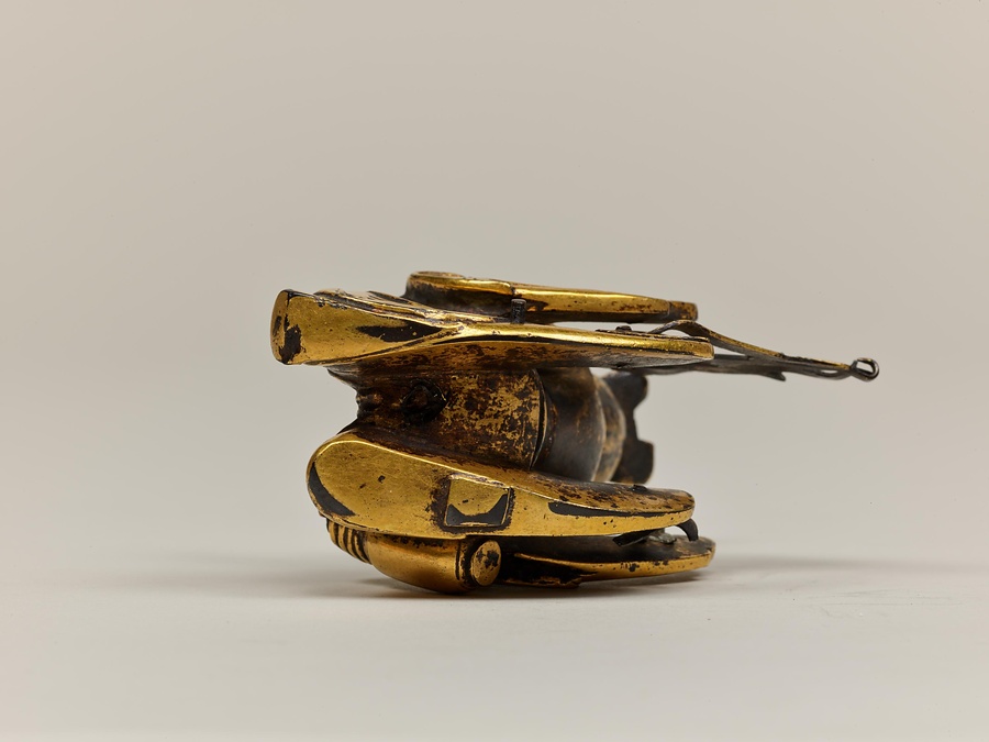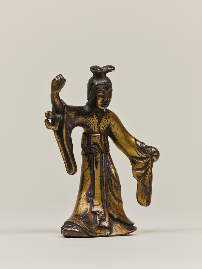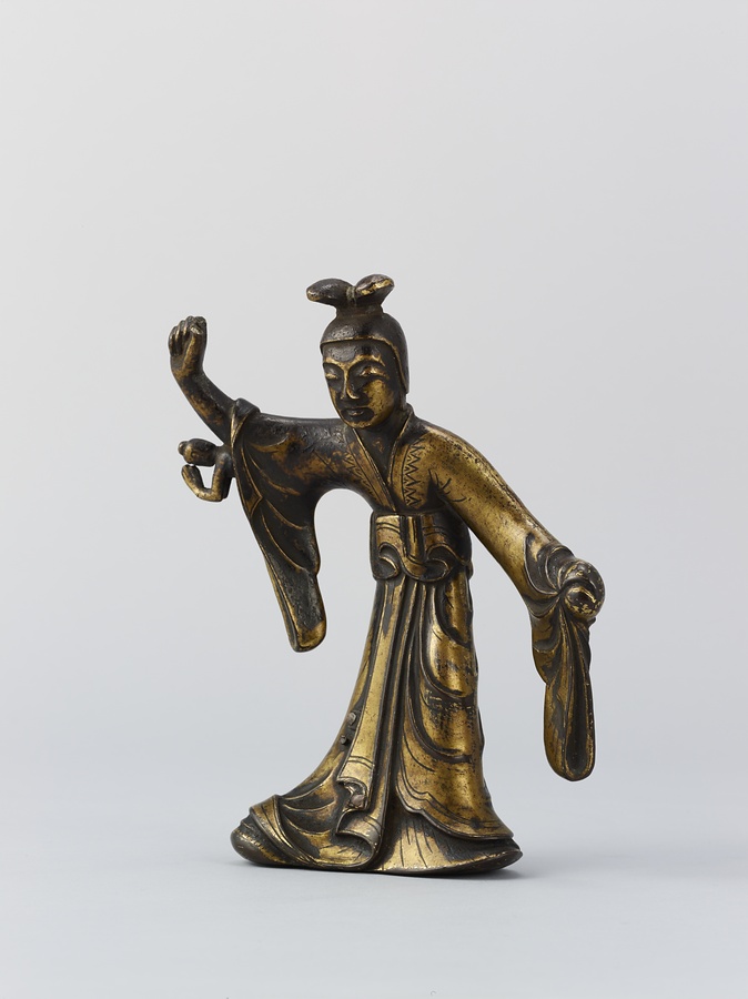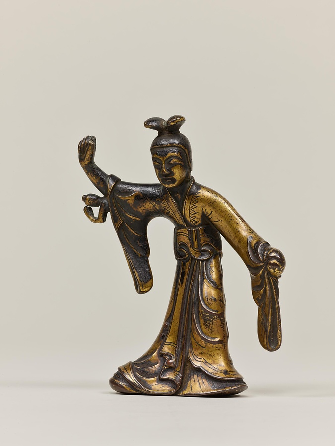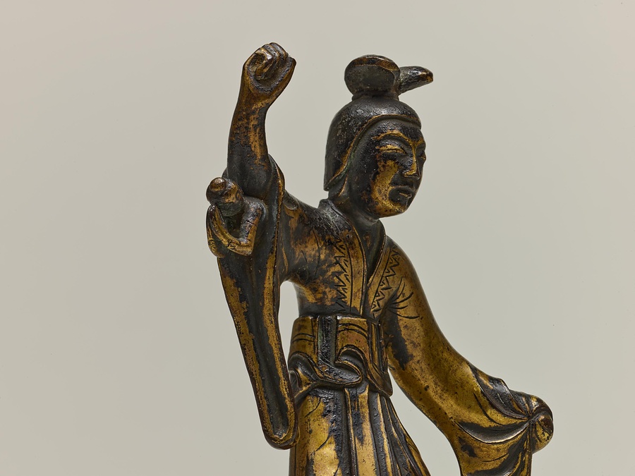 作品を見てみましょう。摩耶夫人は右手を伸ばし、枝をつかむ仕草をしています。足を踏ん張り、左手を衣ごとかたく握っているのは、出産のために力を入れているのでしょう。右脇を見ると、小さなお釈迦様が合掌しながら生れ出ています。その周りには手に水の入った瓶(びん)などを持つ天人たちの像もあります。天人像の底には湾曲した棒が残っているものがあり、もとは宙に浮くように置かれていたと考えられます。この世にお釈迦様が生まれたことをお祝いする4月8日の誕生会(たんじょうえ)で、仏像に水などを注いで洗い清める灌仏に使われた仏像です。