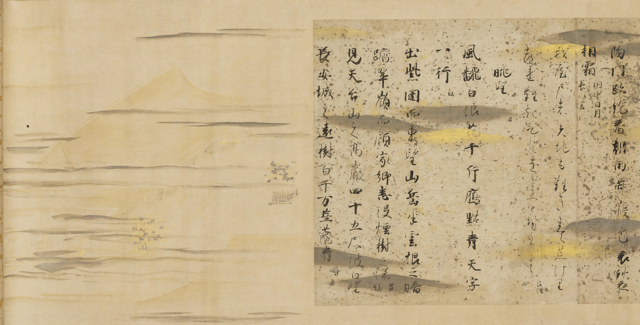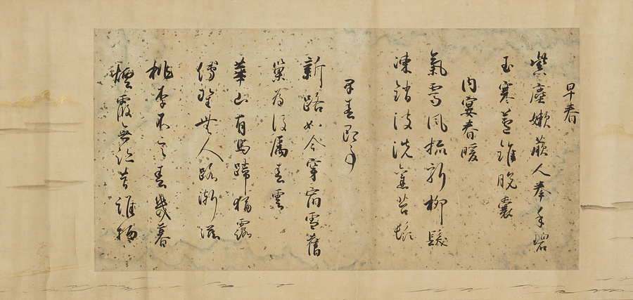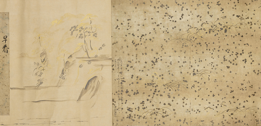 この1巻は冷泉為恭(れいぜいためたか)の遺愛品で、みずから2葉の断簡を合装して台紙の周辺に装飾下絵を描いている。「詩書切」は三跡の1人の藤原行成から数えて4代目の定信の自筆である。「安宅切」は、美しい料紙に『和漢朗詠集』巻下を書写した断簡である。(20050720_h032)