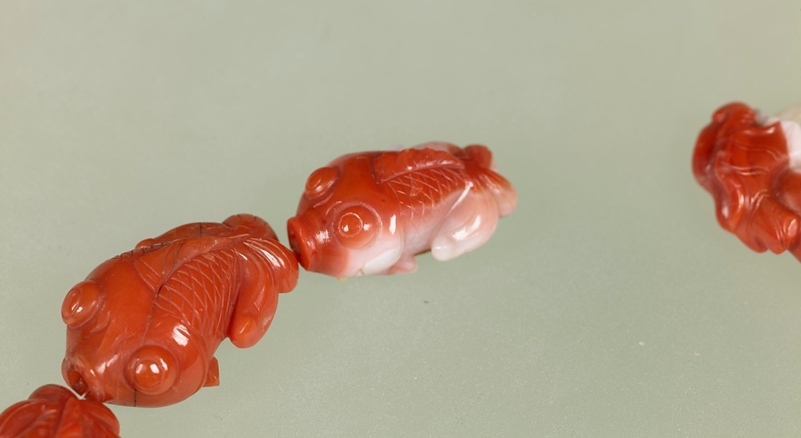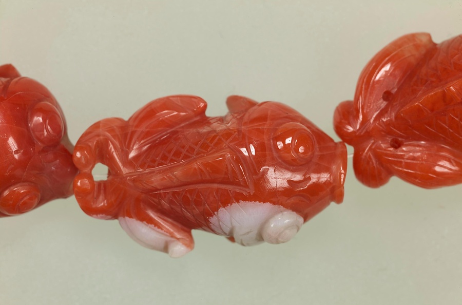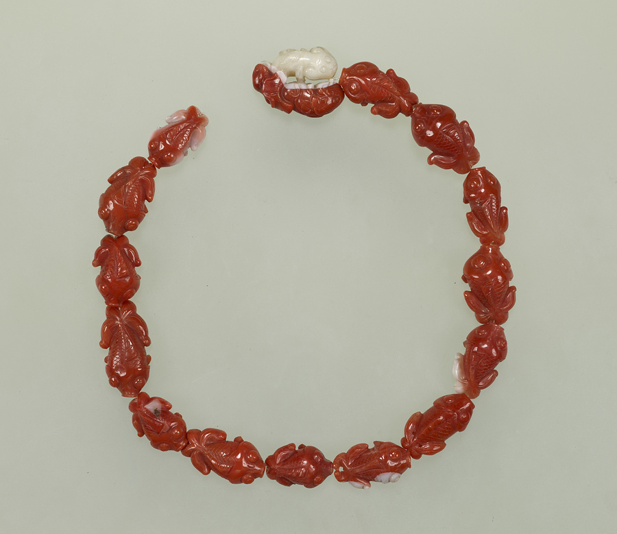 瑪瑙(めのう)を彫った15匹の金魚が一本の糸で繋がっています。金魚はいずれも目玉が大きく、体はまるまるとしてどこかユーモラスな姿をしています。瑪瑙の赤い部分と白い部分をたくみに生かして、金魚の赤と白のまだらが表現されています。中国語では魚(さかな)という漢字の読みが、「余る」という意味に通じることから、金魚はあり余る富を象徴する吉祥の魚として好まれています。