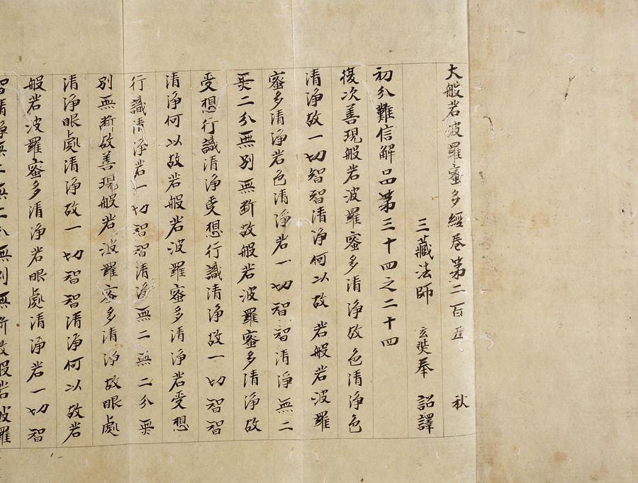 文和3年(1354)正月23日に足利尊氏(1305~58)が、後醍醐天皇や両親および戦没者の供養と天下泰平を祈願し、京都、鎌倉などの諸寺院の僧に書写させ菩提寺の等持院に奉納した一切経の一つ。各帖末の木版刷りの発願文には「尊氏」の自署がある。