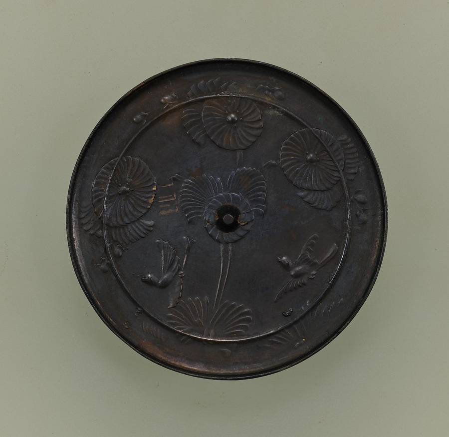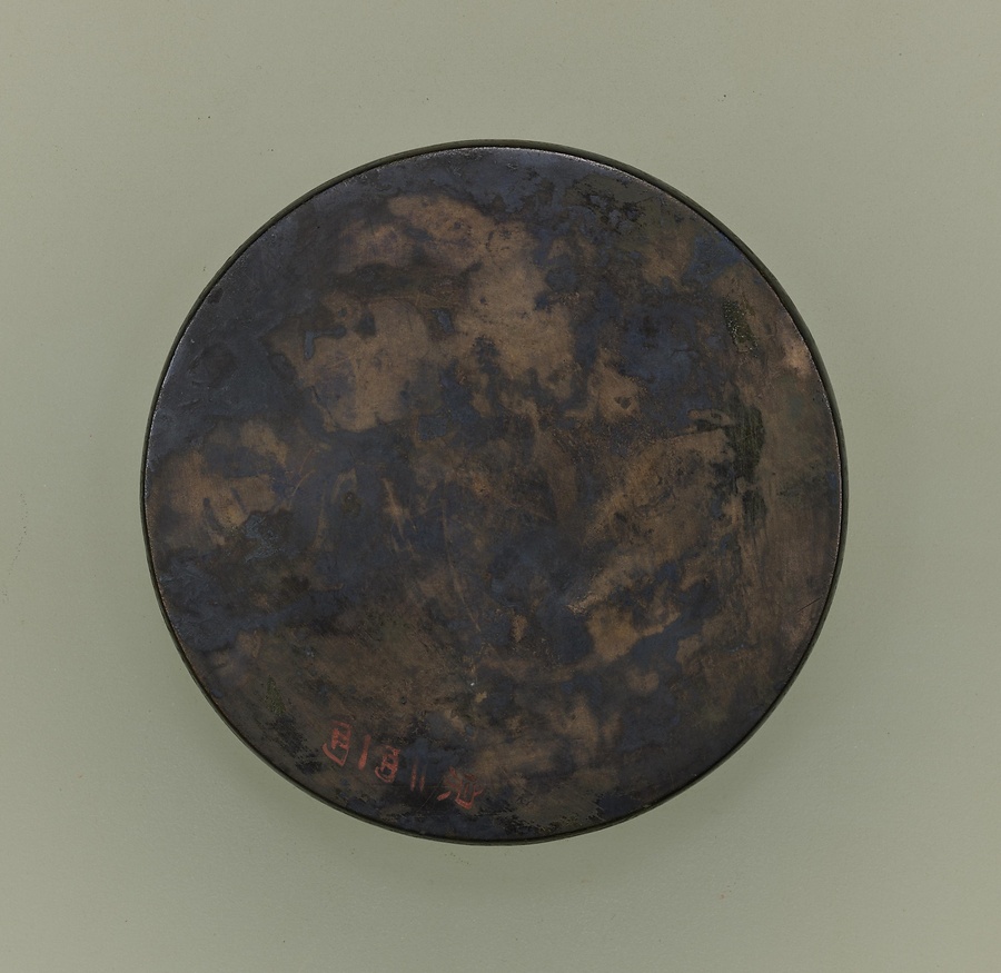 お釈迦さまの死の2000年後、救いのない時代が56億7000万年も続くと考えられました。経筒はその長い間、お経を入れて地下で守るために作られたタイムカプセルです。底をのぞくと、もようが見えます。実はこれ、金属で作った鏡のうら側なんです。底に鏡を使ったのには、リサイクル説や経典を守るおまじない説などがあります。