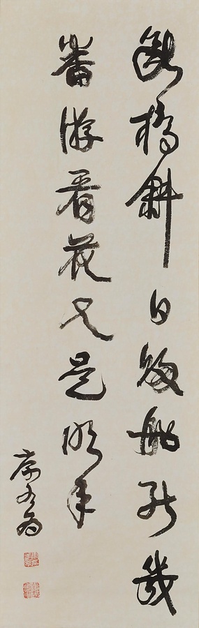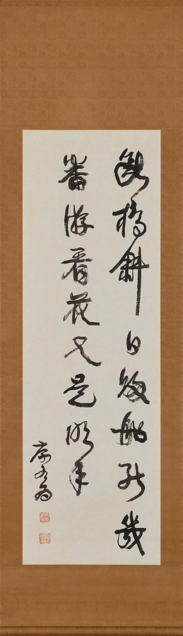 康有為【こうゆうい】は、清末の学者・政治家。戊戌変法(1898)に失敗し、その後の十数年間を海外で過ごしました。本作は、大正元年(1912)前後、須磨での揮毫と推察されます。新たな学説を紹介したその著『広芸舟双楫』は、日本の書壇に大きな影響を与えました。