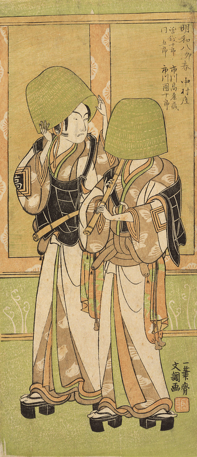 江戸歌舞伎の三座では、新春の吉例として曽我狂言が上演されました。本図は、明和8年(1771)正月中村座『堺町曽我年代記』の虚無僧姿の対面。江戸歌舞伎全盛時代を代表する名優五代目市川団十郎が五郎を、後に四代目松本幸四郎を襲名する二代目市川高麗蔵が十郎を演じました。