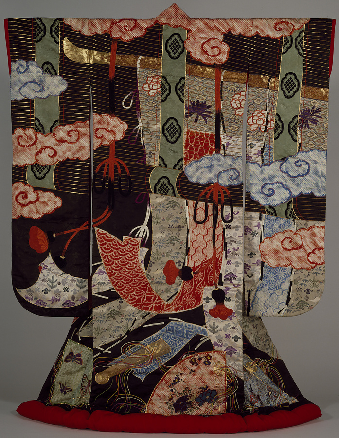 花熨斗文様打掛とともに、大正十三年に京都で結婚した女性のために誂えられた婚礼衣裳のうちの一領である。江戸時代後期の打掛と同様に、御簾・几帳・檜扇と、王朝時代を想起させる文様で彩られている。王朝を思わせる文様が優雅さや趣味の高さをあらわすだけでなく、一種の吉祥文様と捉えられていたのであろう。